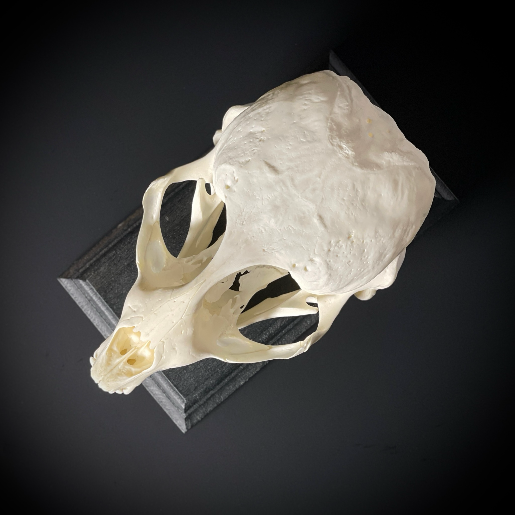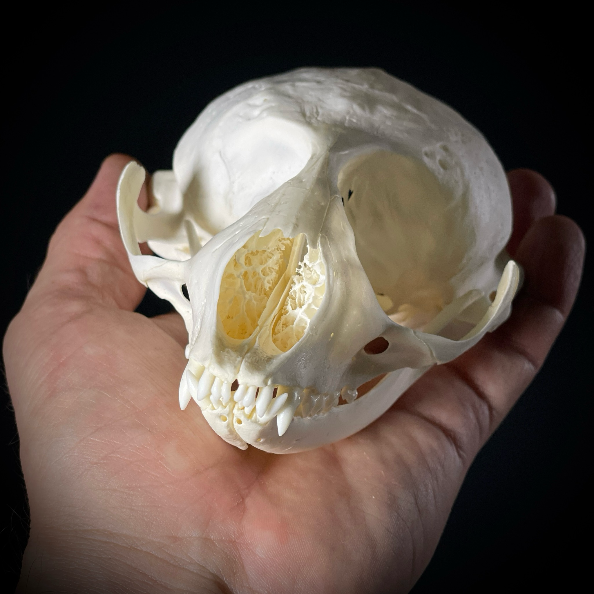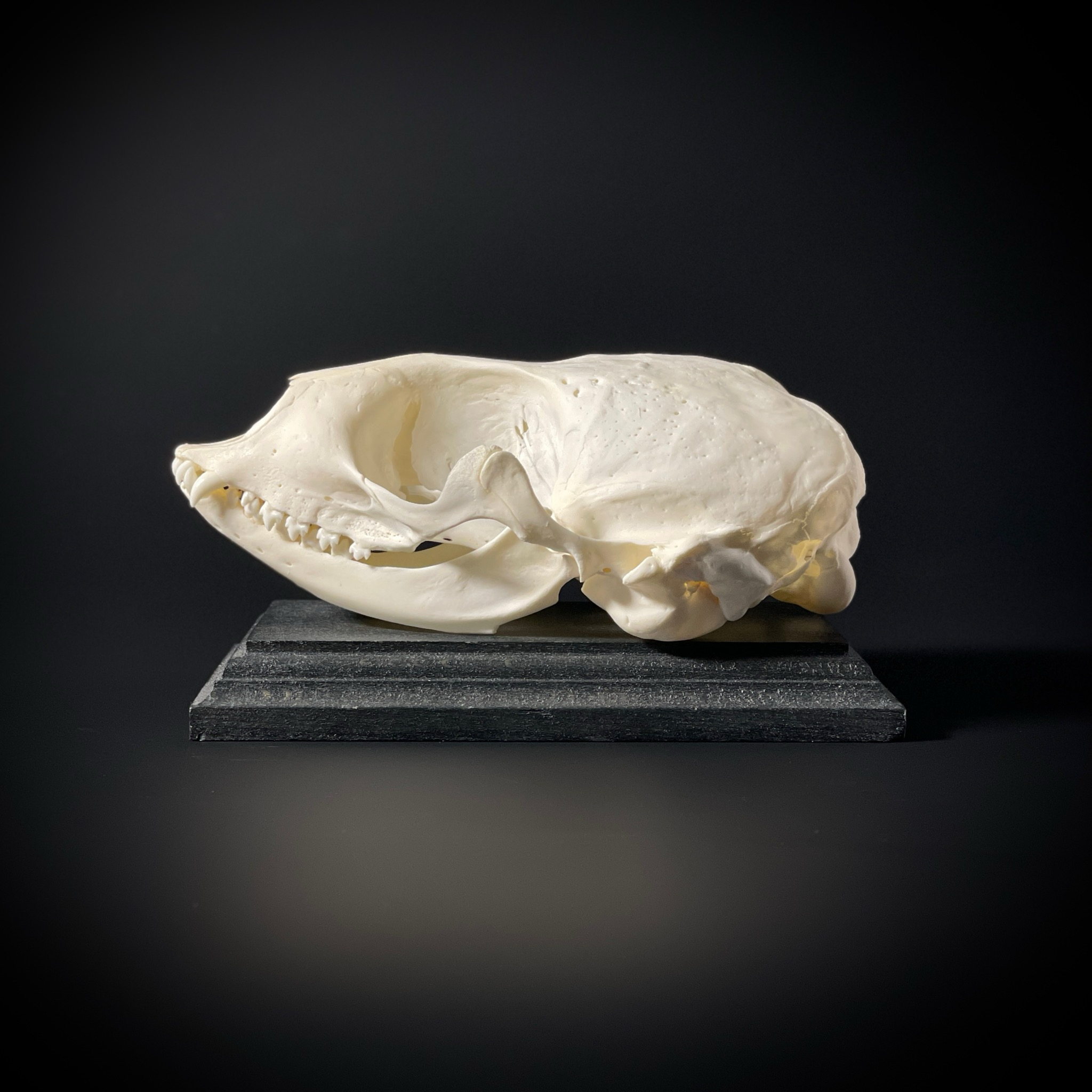 Материал изделия - пластик высокого качества. Голова - гиперреалистичная модель черепа человека, мужской европейский «Ариец», харизматичный большой череп в масштабе 1:1. Размер черепа: высота - 16 см, глубина - 25 см, ширина - 15 см. Высота всего изделия - 33 см. Изделие выглядит массивно.
