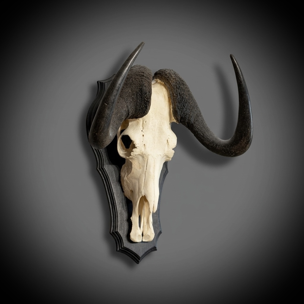 Эксклюзивный арт‑объект: череп антилопы белохвостого гну на деревянном медальоне из бука - безупречная красота и роскошь для вашего интерьера.