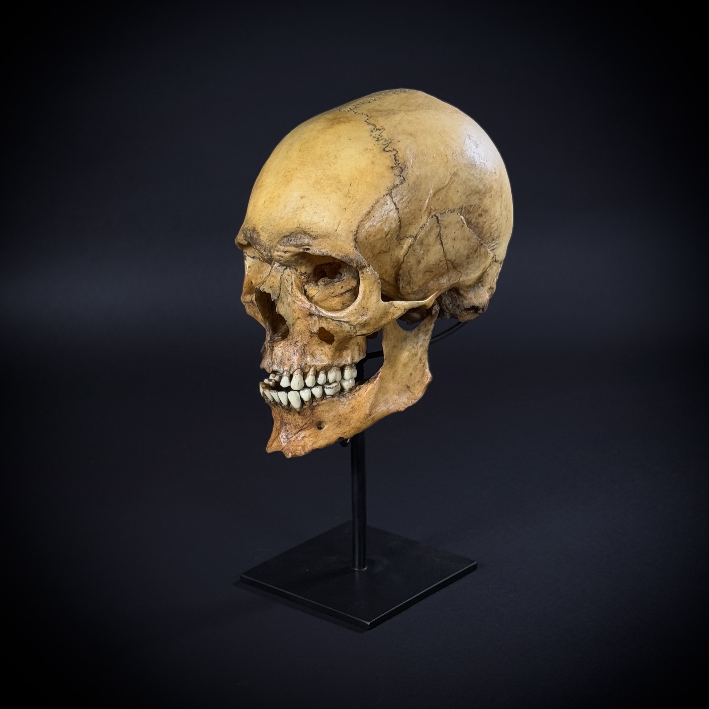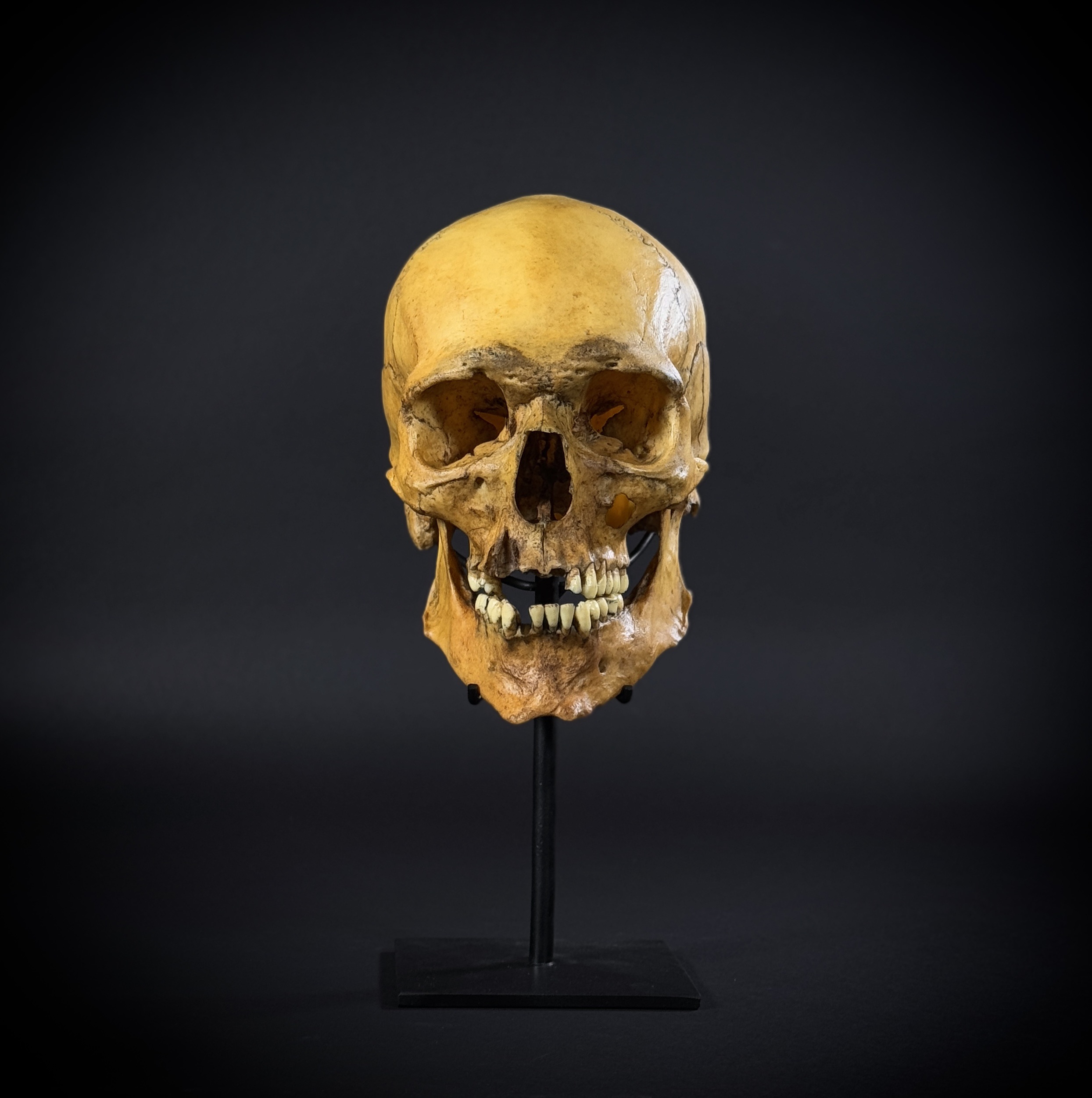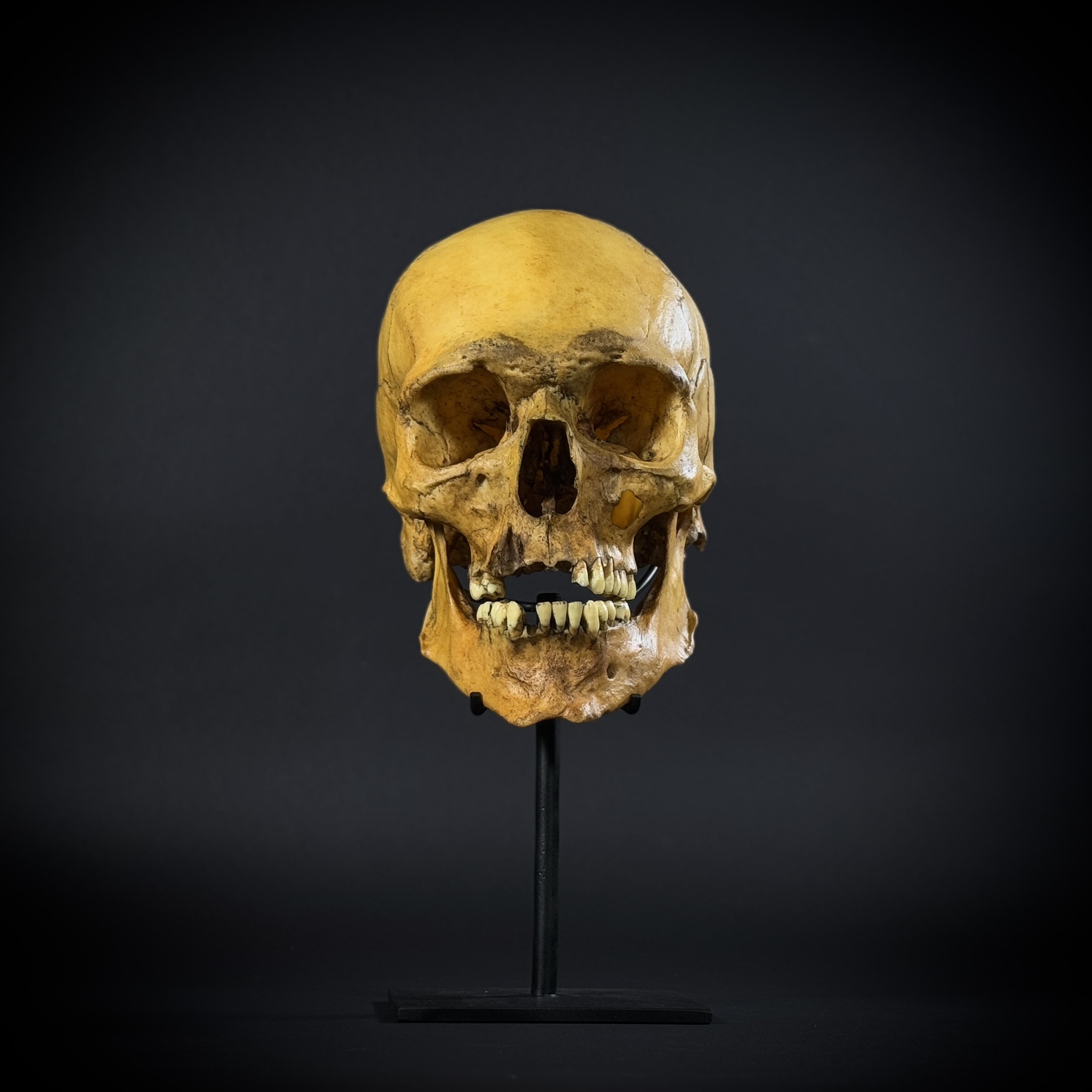 Модель черепа человека, мужской европейский «Ариец». Харизматичный большой мужской череп в масштабе 1:1. Размер черепа: высота - 16 см, глубина - 25 см, ширина - 15 см.Нижняя челюсть у черепа съемная, отдельный элемент. Материал стойки - сталь. Высота изделия на стойке - 32 см. Череп снимается со стойки, не закреплён.