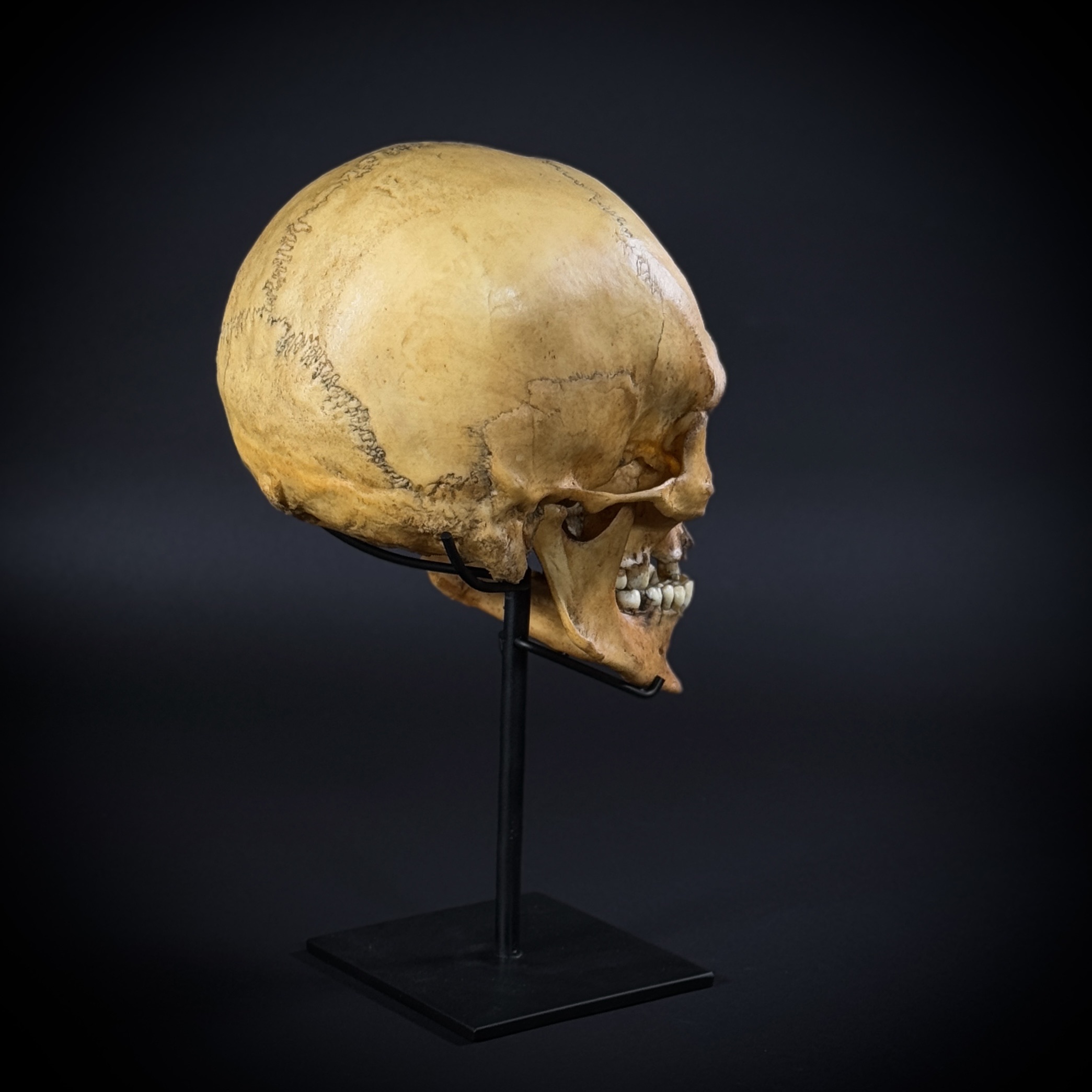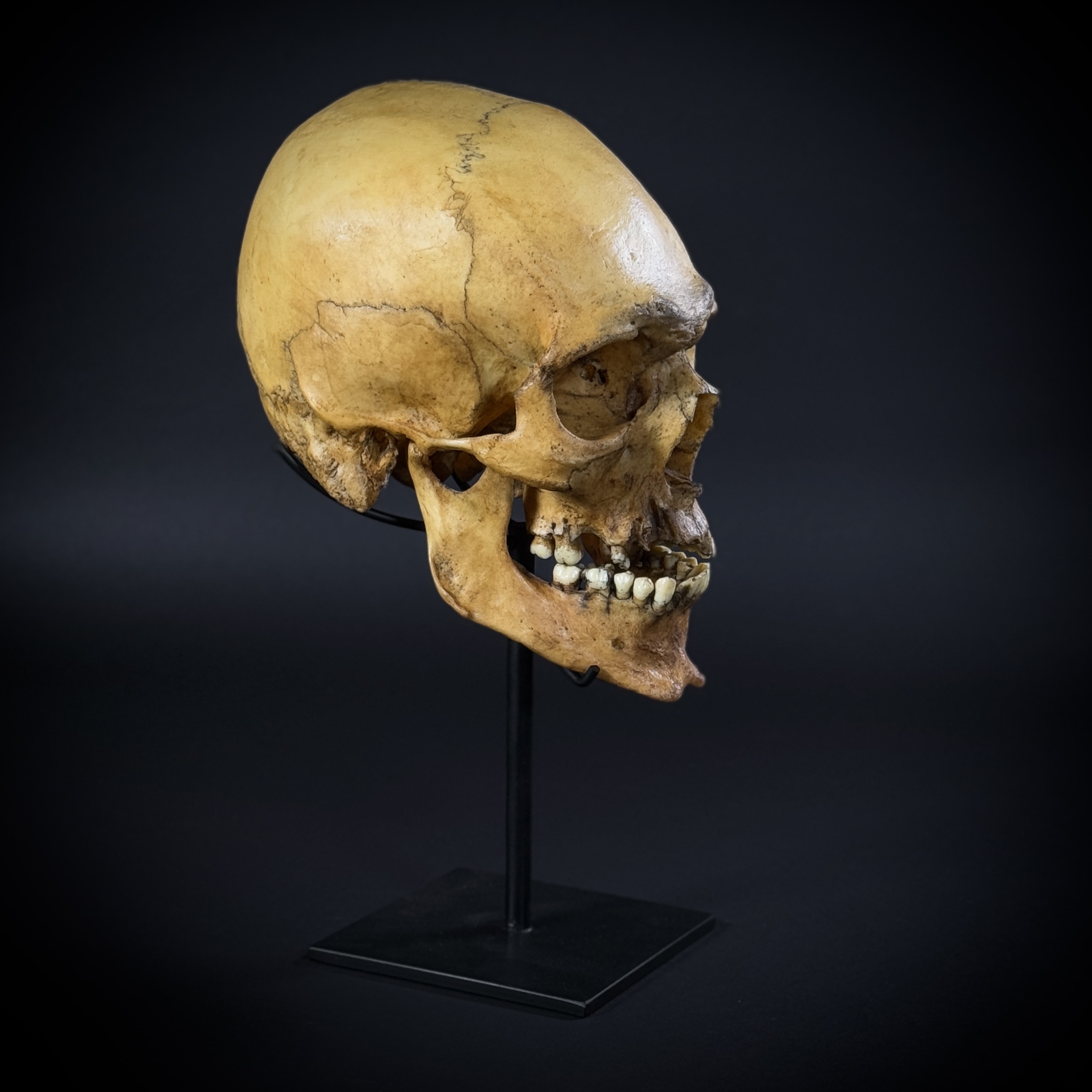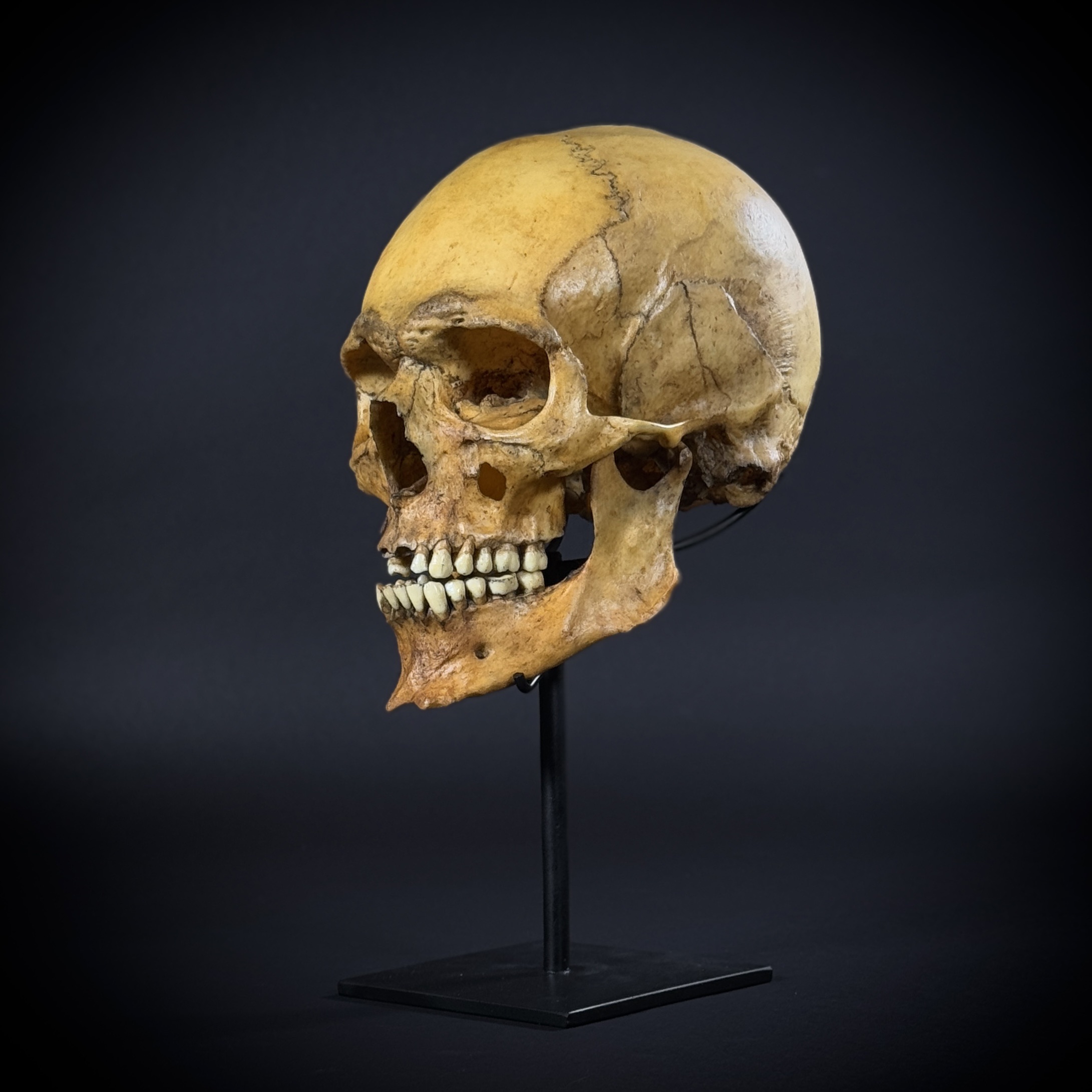 Модель черепа человека, мужской европейский «Ариец». Харизматичный большой мужской череп в масштабе 1:1. Размер черепа: высота - 16 см, глубина - 25 см, ширина - 15 см.Нижняя челюсть у черепа съемная, отдельный элемент. Материал стойки - сталь. Высота изделия на стойке - 32 см. Череп снимается со стойки, не закреплён.