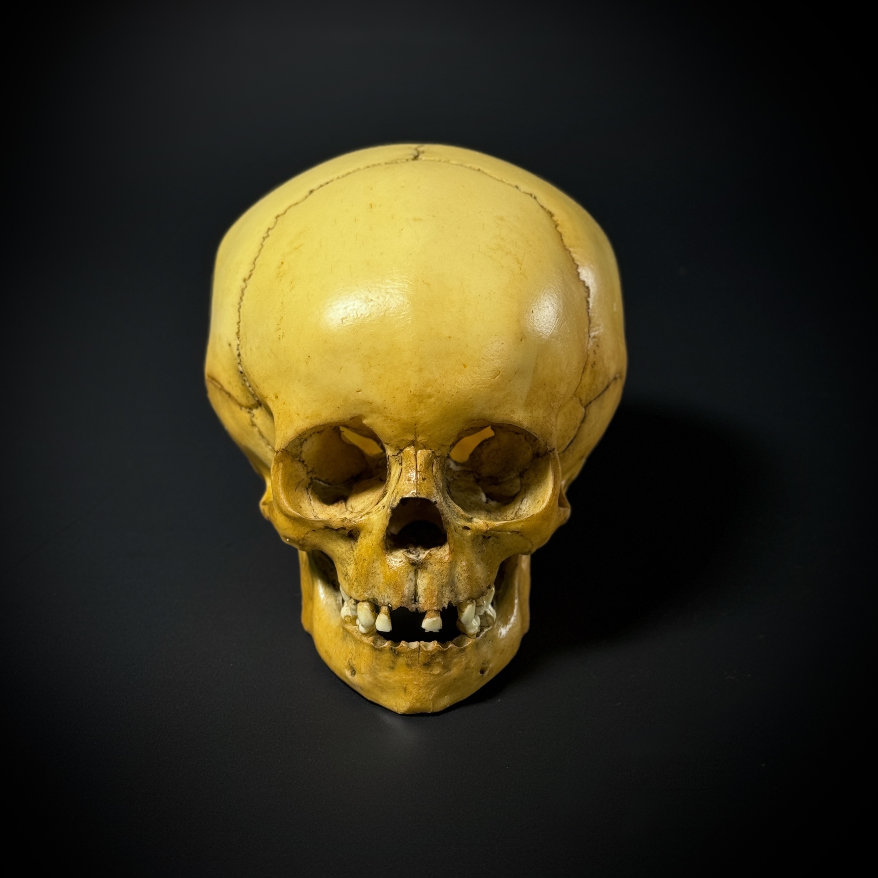 Гиперреалистичная модель черепа человека в масштабе 1:1, ребенок 4-5 лет. Размер черепа: высота – 13 см, ширина - 9 см, глубина - 15 см. Материал черепа - полиуретан, лёгкий и прочный, исключительно точно повторяющий настоящий череп человека до мельчайших деталей. Полностью ручная работа, ручное окрашивание, имитирующее настоящий оттенок костей черепа. Цвет каждого изделия может незначительно отличаться от изображения. Зубы отлиты отдельно и вклеены. Нижняя челюсть - отдельный элемент, не прикреплена к черепу.