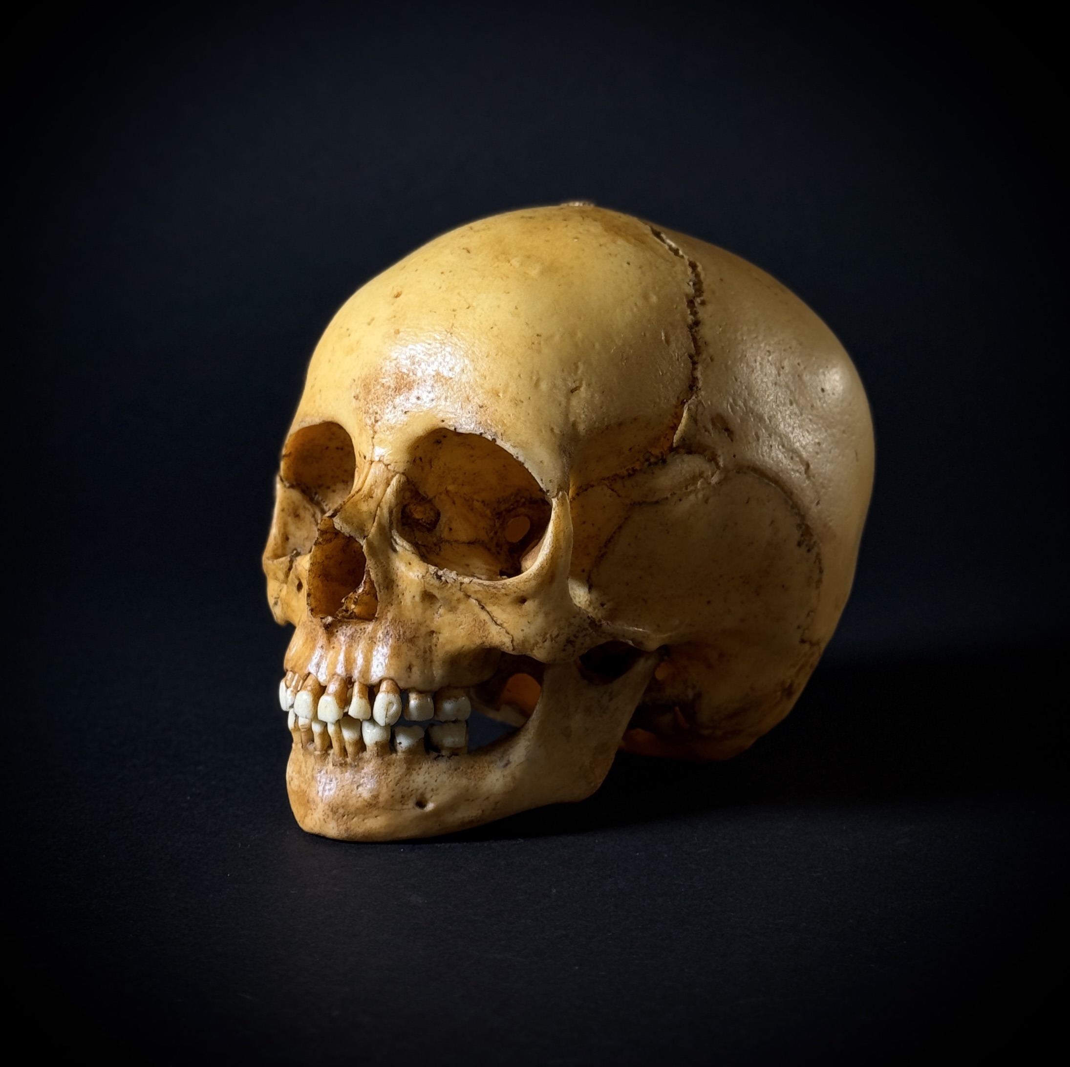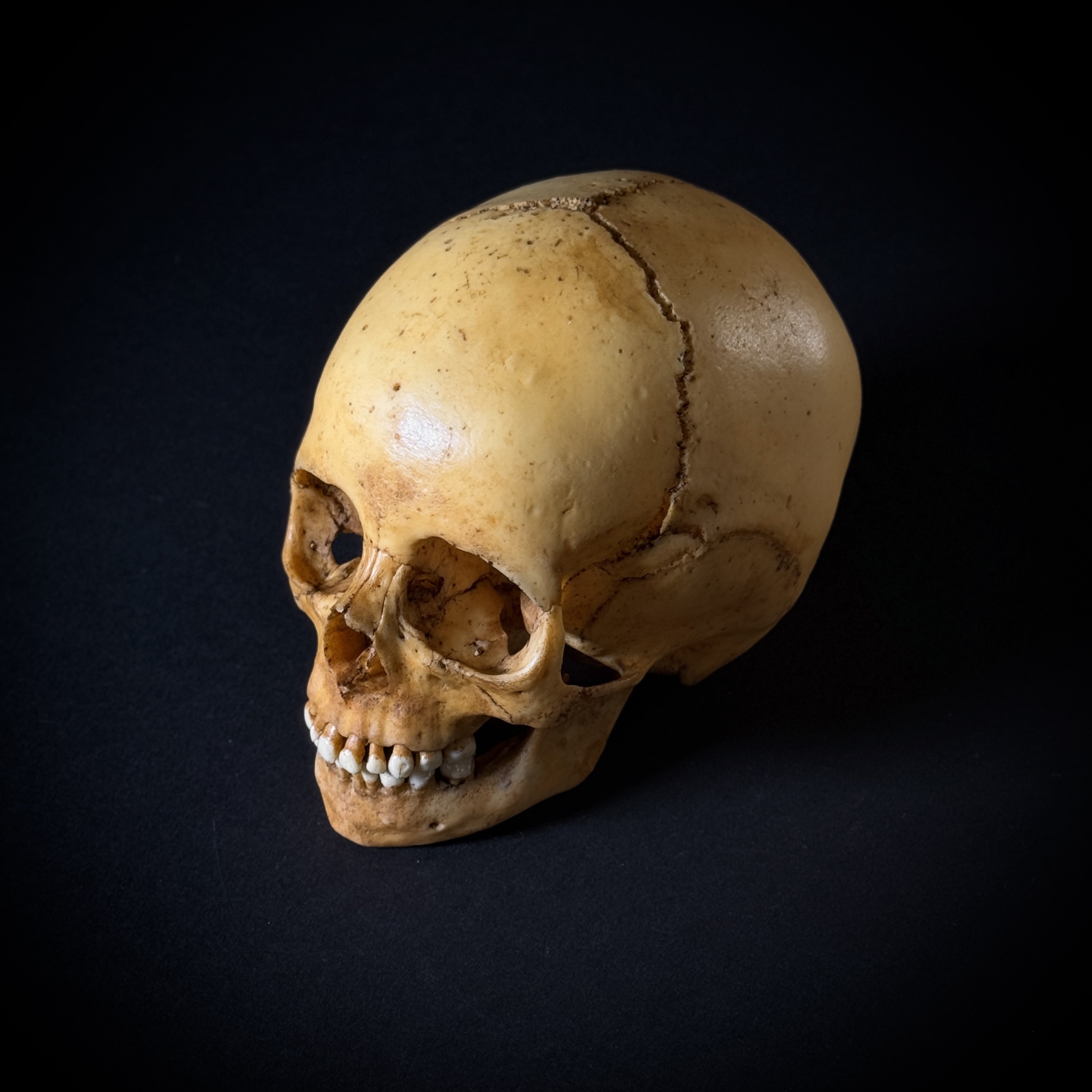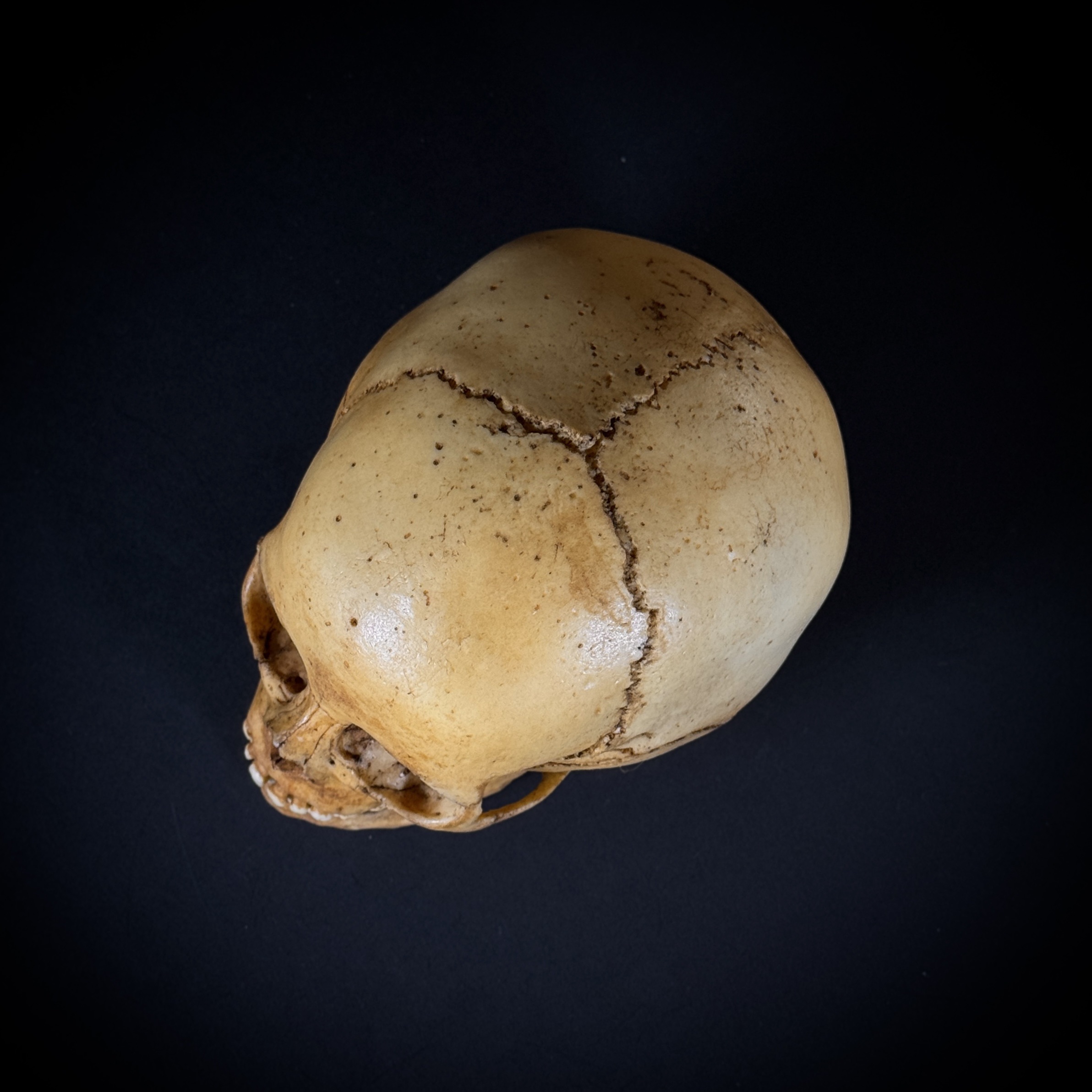 Гиперреалистичная модель черепа человека в масштабе 1:1, ребенок - 3 года. Размер черепа: высота – 13 см, ширина - 12 см, глубина - 16 см. Материал черепа - полиуретан, лёгкий и прочный, исключительно точно повторяющий настоящий череп человека до мельчайших деталей. Полностью ручная работа, ручное окрашивание, имитирующее настоящий оттенок костей черепа. Цвет каждого изделия может незначительно отличаться от изображения. Зубы отлиты отдельно и вклеены. Нижняя челюсть - отдельный элемент, не прикреплена к черепу.