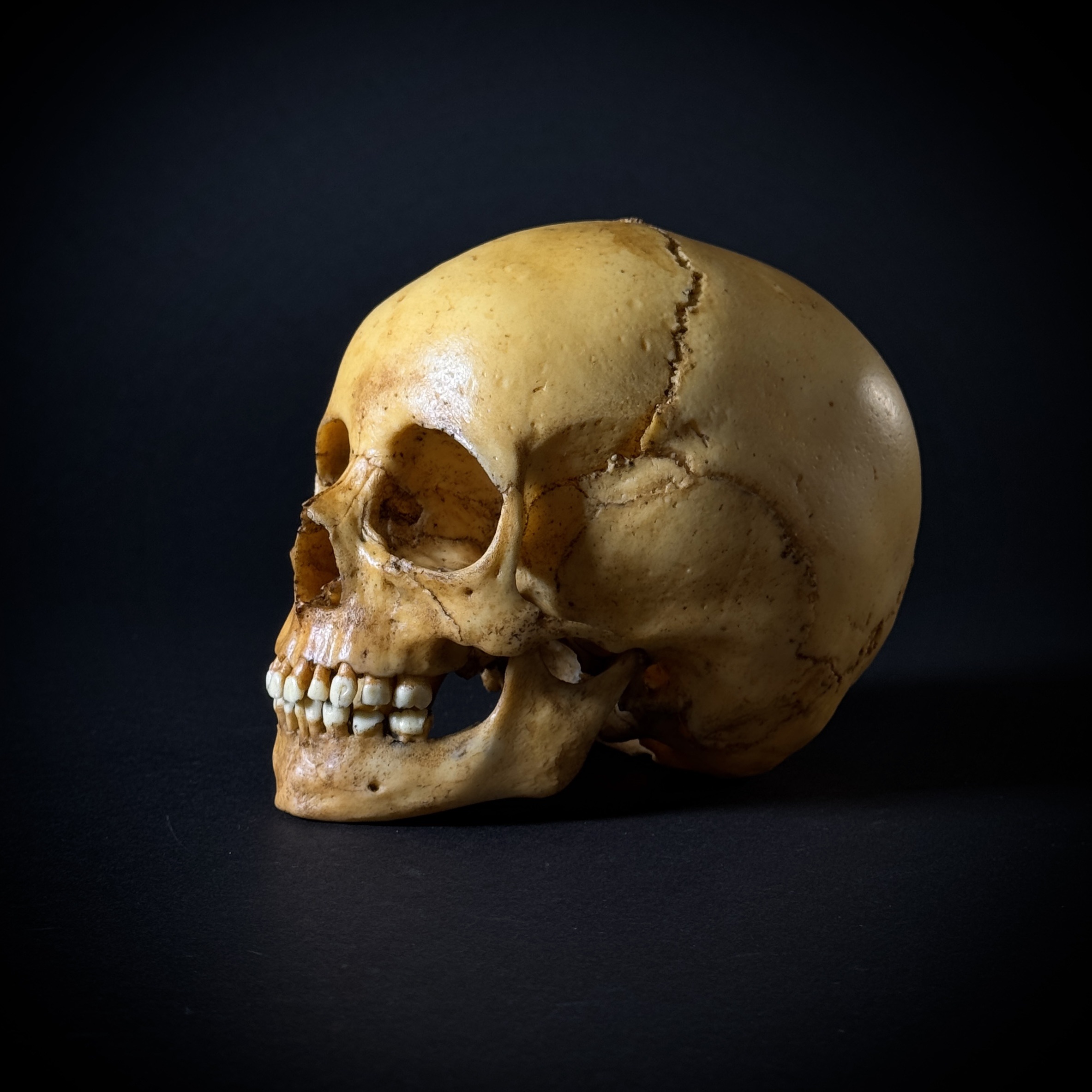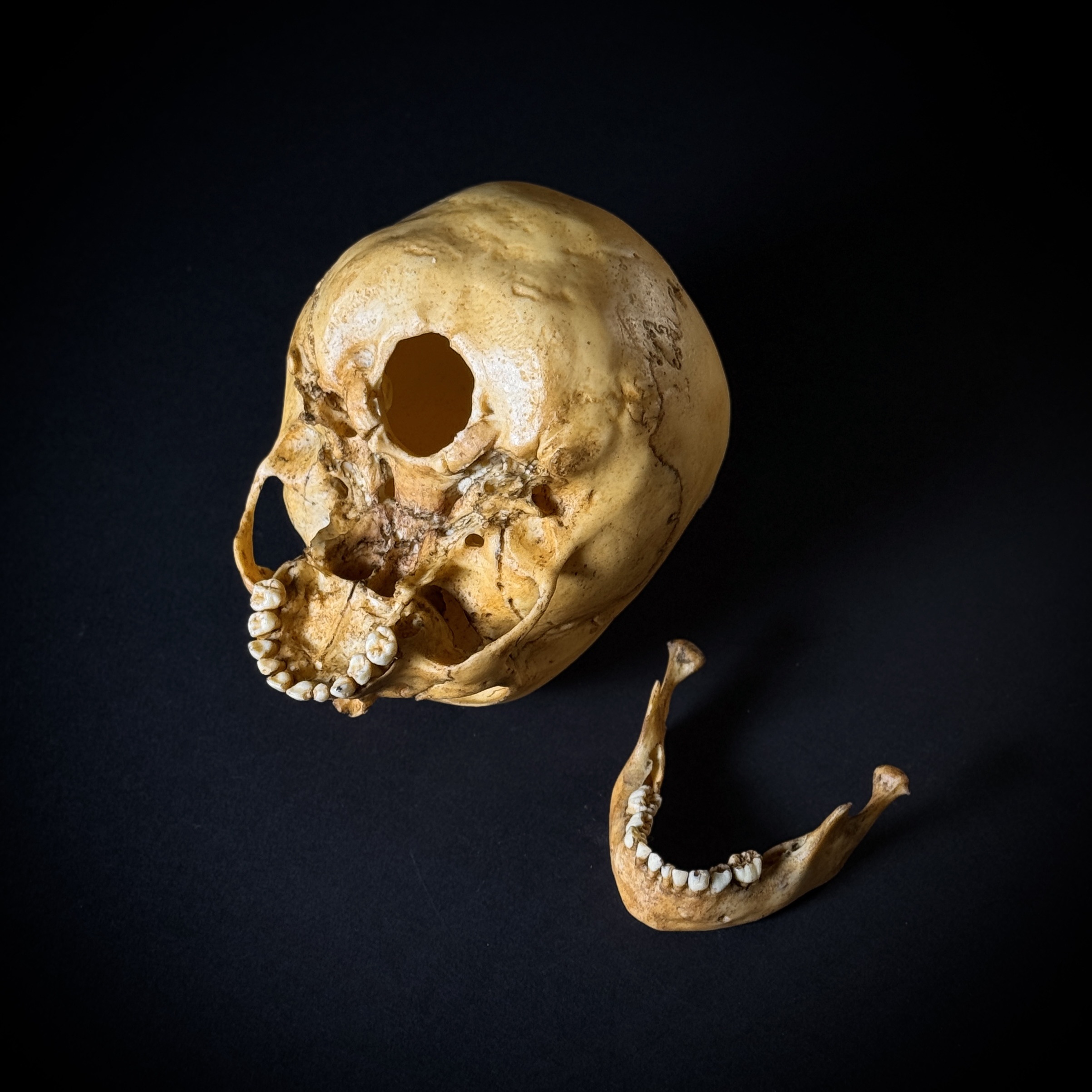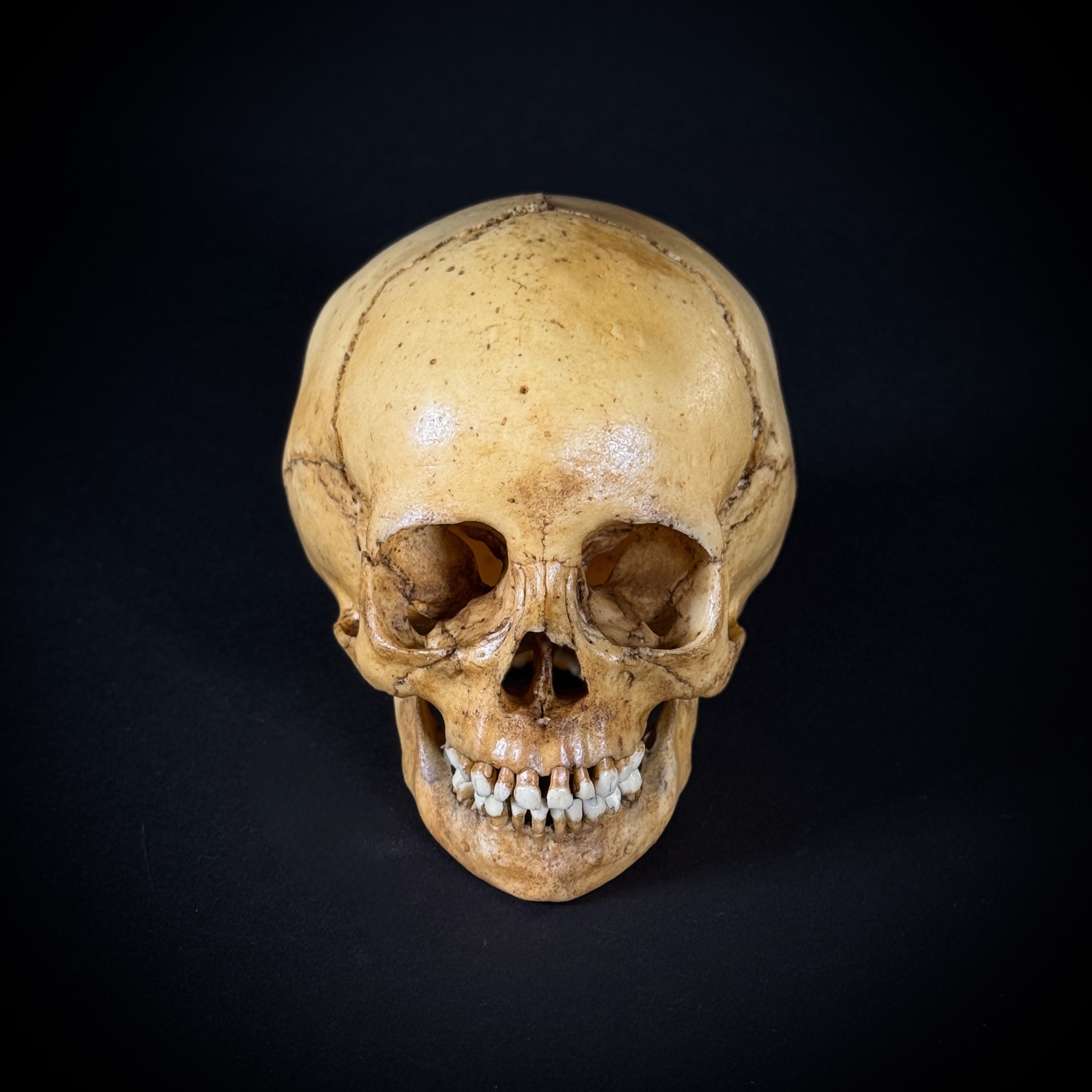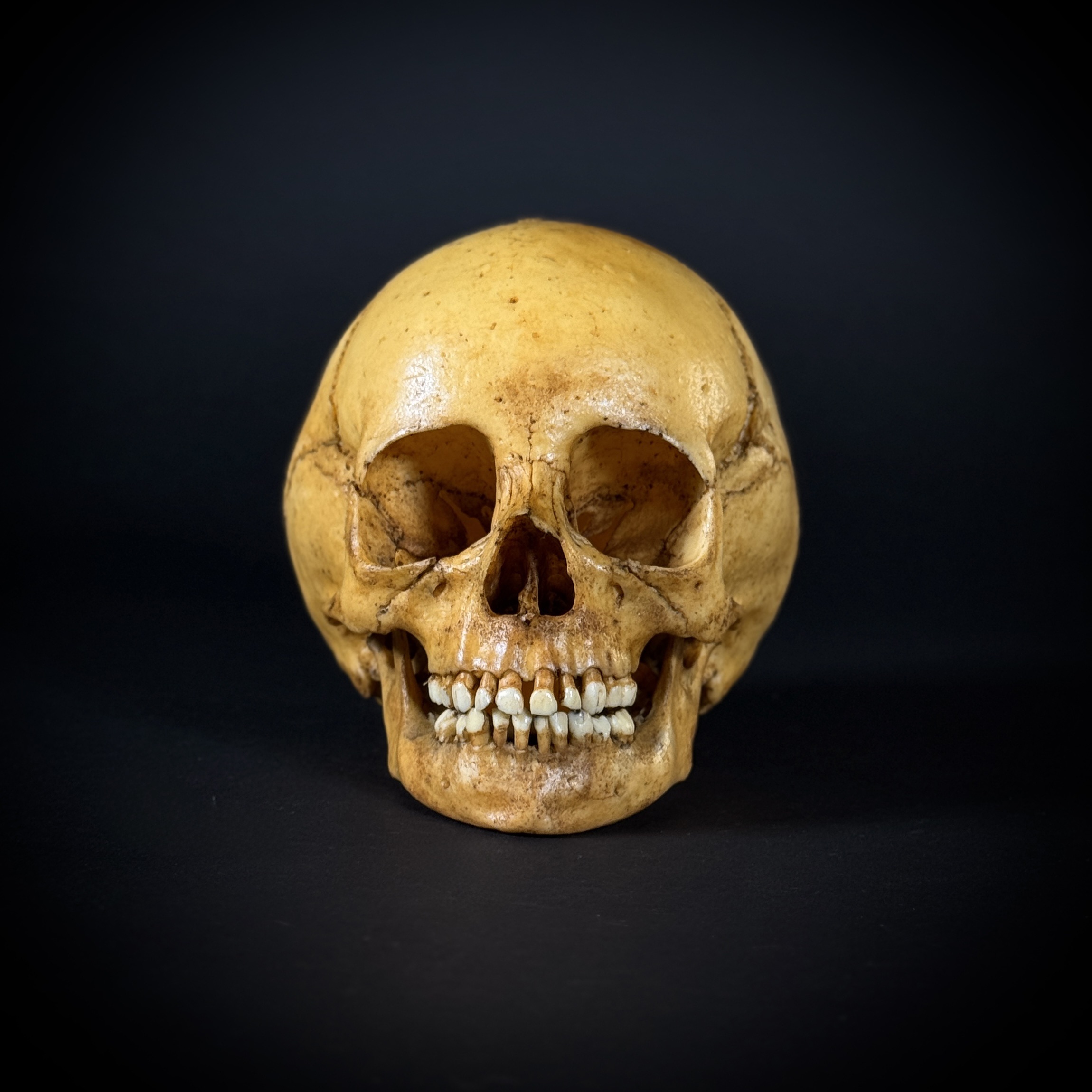Гиперреалистичная модель черепа человека в масштабе 1:1, ребенок - 3 года. Размер черепа: высота – 13 см, ширина - 12 см, глубина - 16 см. Материал черепа - полиуретан, лёгкий и прочный, исключительно точно повторяющий настоящий череп человека до мельчайших деталей. Полностью ручная работа, ручное окрашивание, имитирующее настоящий оттенок костей черепа. Цвет каждого изделия может незначительно отличаться от изображения. Зубы отлиты отдельно и вклеены. Нижняя челюсть - отдельный элемент, не прикреплена к черепу.