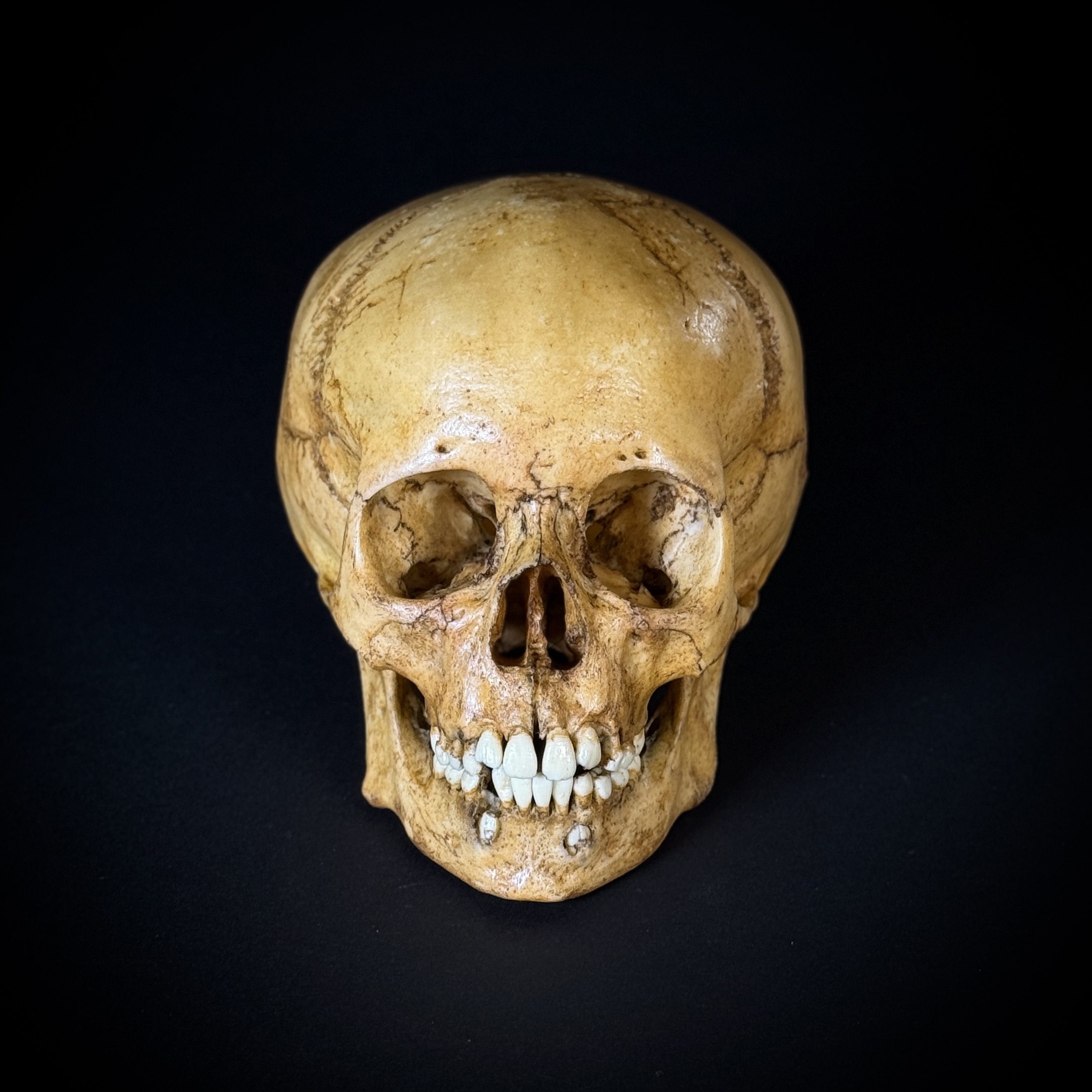 Гиперреалистичная модель черепа человека в масштабе 1:1, ребенок 8-9 лет. Размер черепа: высота – 13,5 см, ширина - 13,5 см, глубина - 18 см. Материал черепа - полиуретан, лёгкий и прочный, исключительно точно повторяющий настоящий череп человека до мельчайших деталей. Полностью ручная работа, ручное окрашивание, имитирующее настоящий оттенок костей черепа. Цвет каждого изделия может незначительно отличаться от изображения. Зубы отлиты отдельно и вклеены. Нижняя челюсть - отдельный элемент, не прикреплена к черепу.