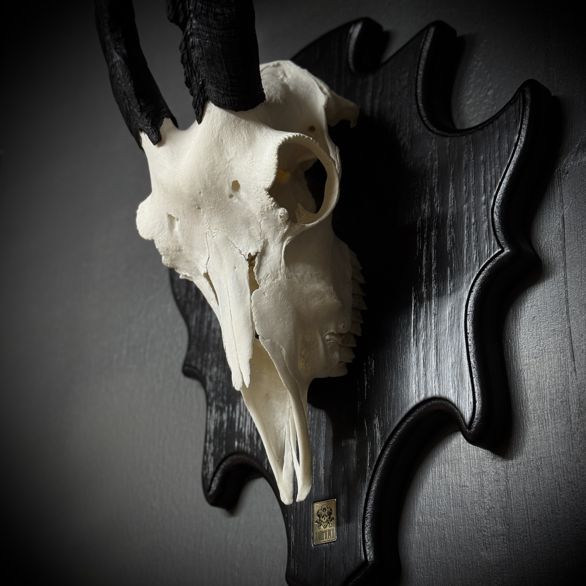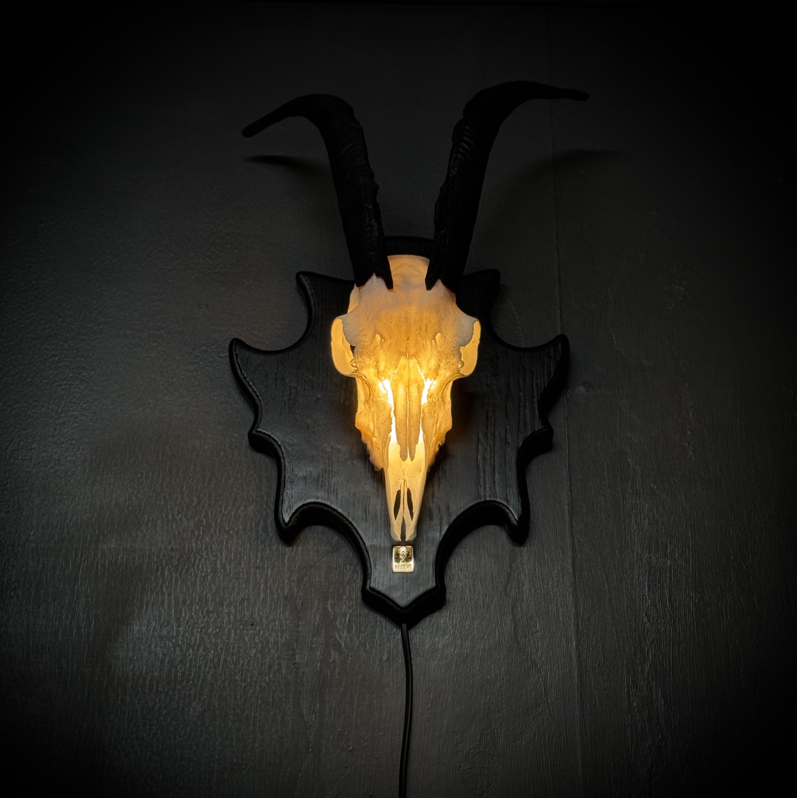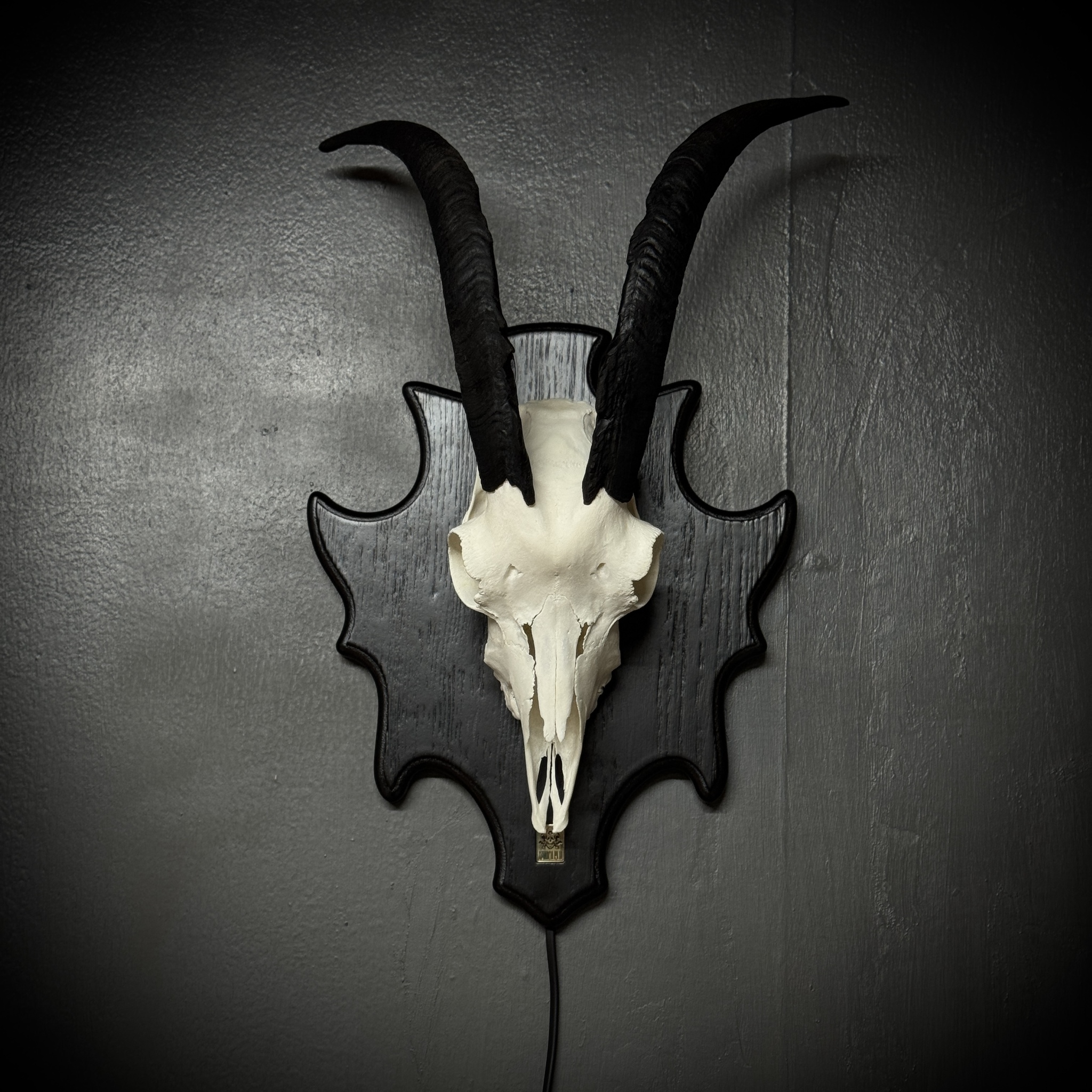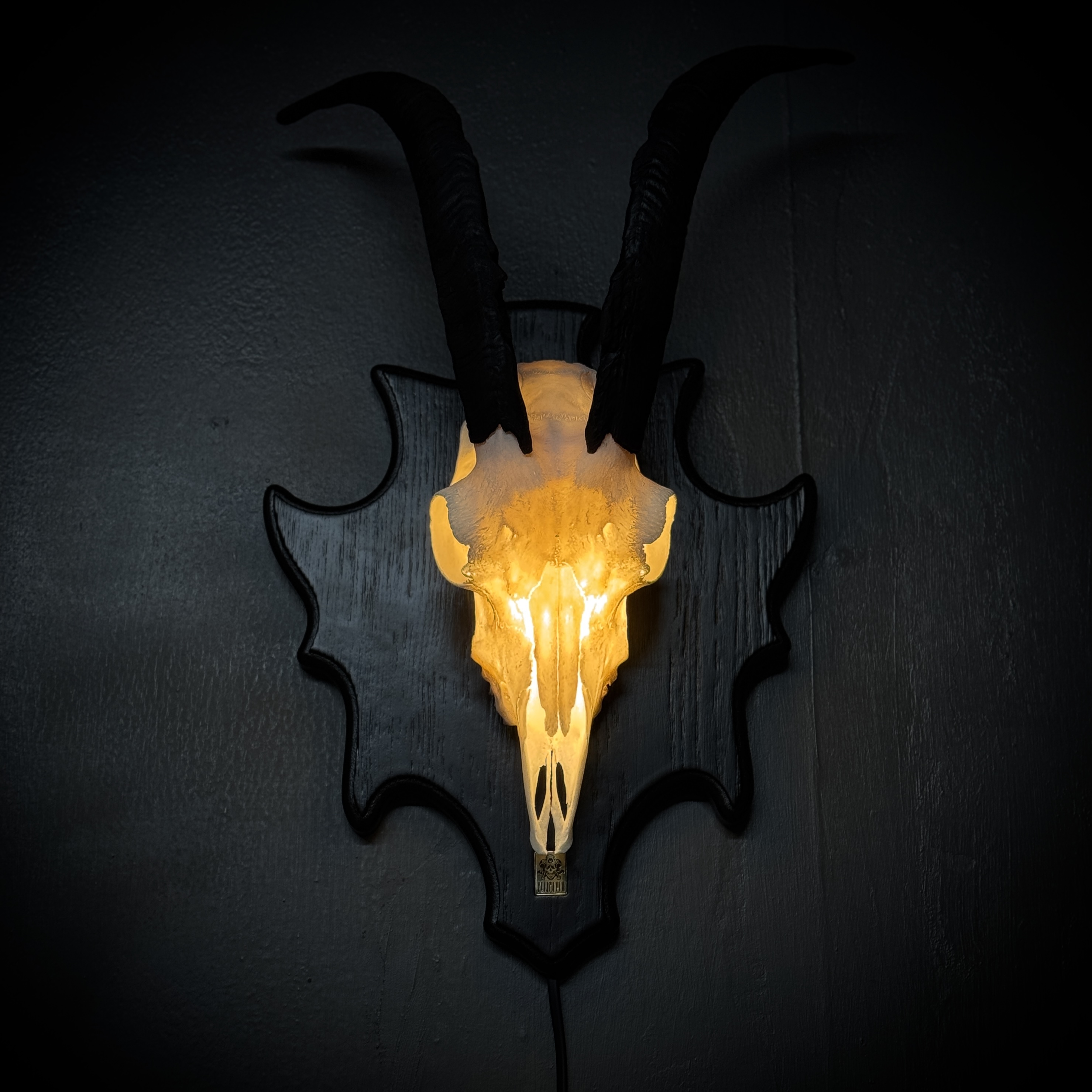 Череп козла на медальоне - ночник. Габариты изделия: размах рогов - 45 см, длина/глубина - 29/16 см. Подсветка - светодиодная лампа 3-4 Вт 220В, шнур 1,5 метра, выключатель на шнуре. Для безопасной транспортировки роговые чехлы съёмные. Фотографии наших изделий являются неотъемлемой частью описания товара, вы покупаете именно то, что видите на фото.