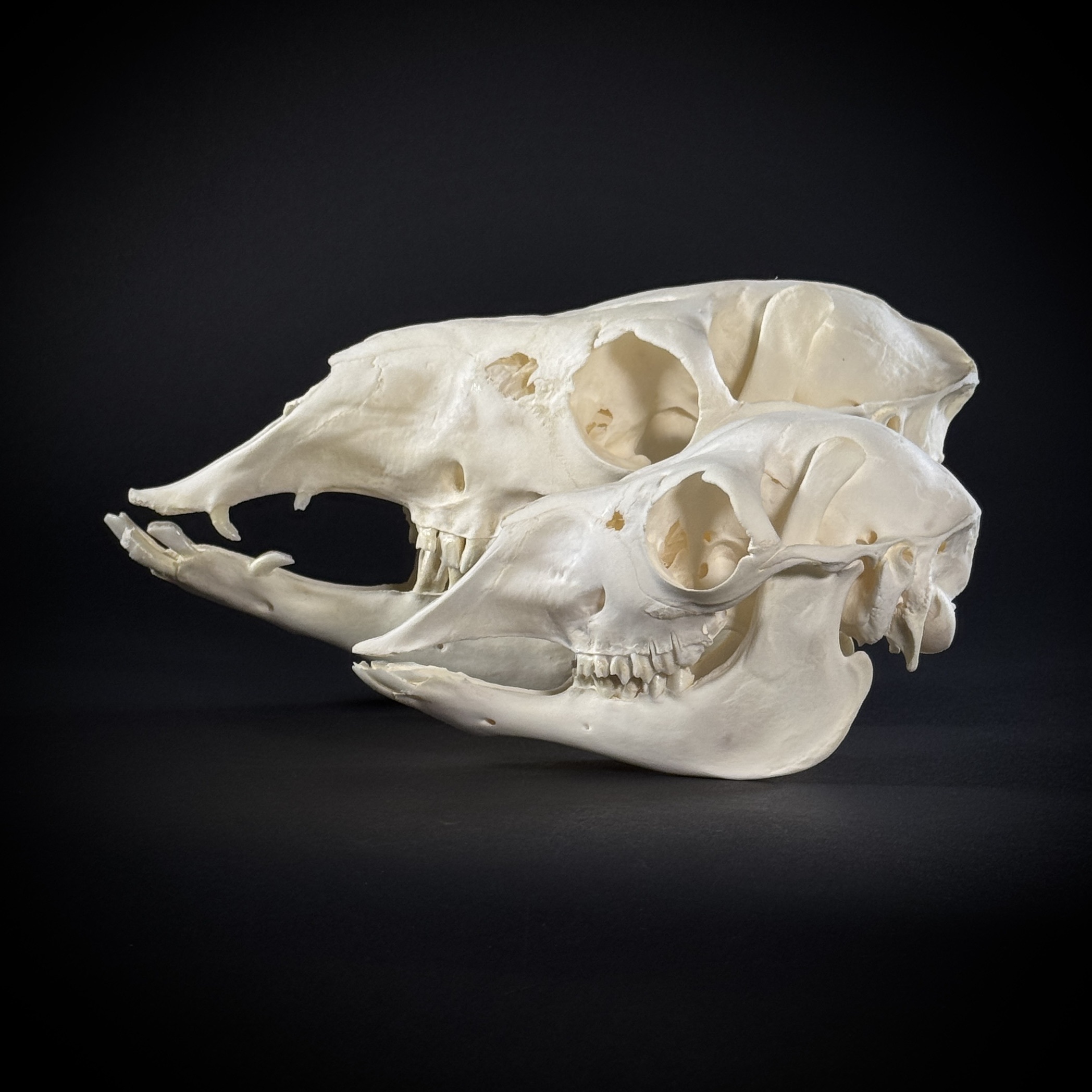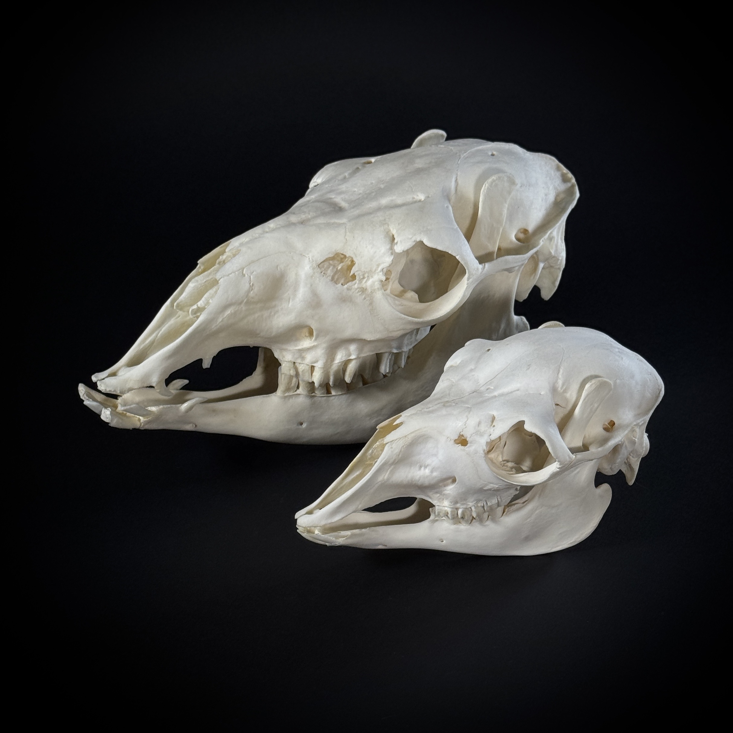Череп ламы: взрослая особь + молодая осот. Размер черепа ламы взрослой особи - 32х14х17 см. Размер черепа ламы молодой особи - 21х11х13 см. Удивительное животное, млекопитающее из семейства верблюдовых. Животное играло важнейшую роль в скотоводстве инков. Лама отличается от альпаки большим размером и более удлинённой головой. В отличие от верблюдов, ламы не имеют горба, в остальном у них много общих черт.