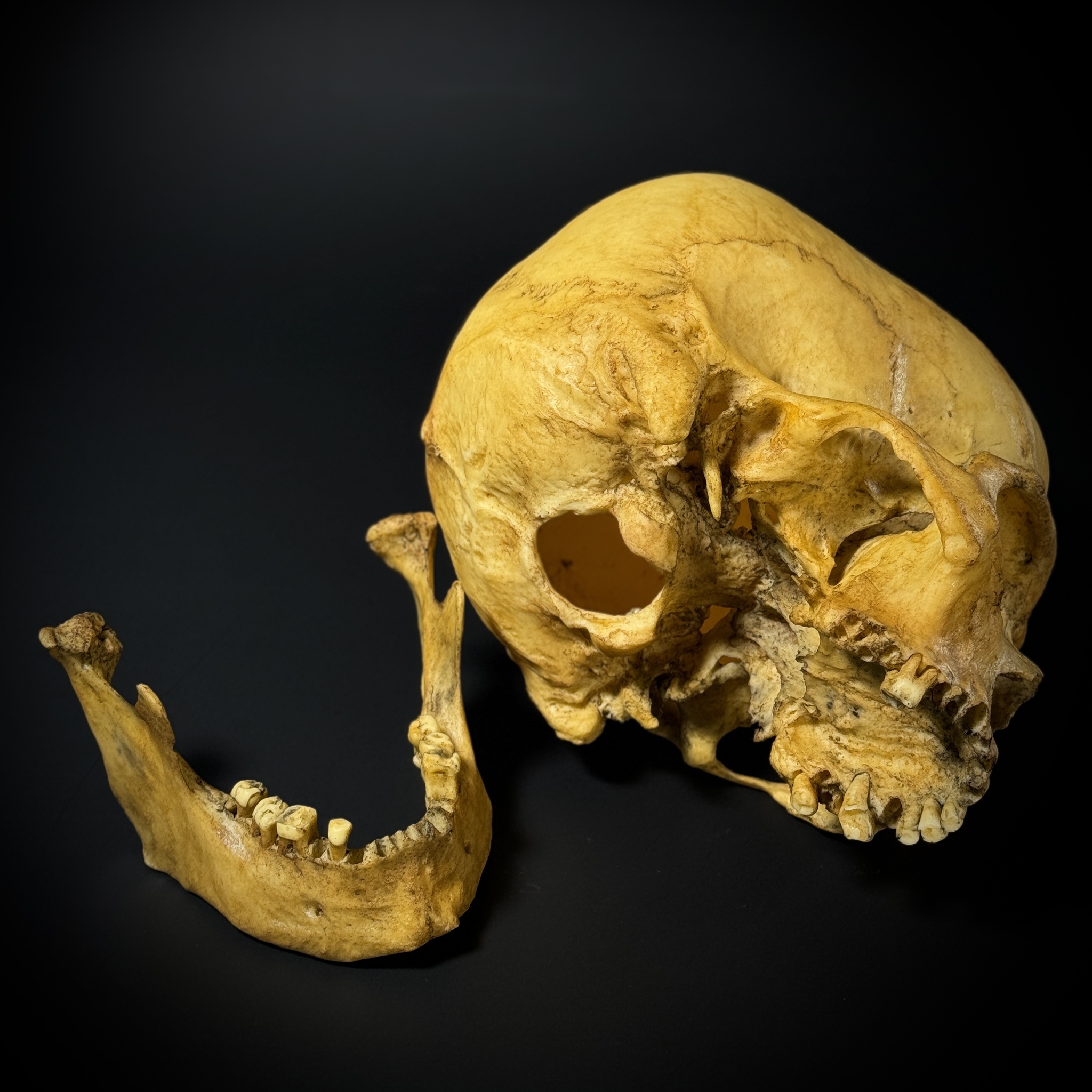 Материал черепов - полиуретан, лёгкий и прочный, исключительно точно повторяющий настоящий череп человека до мельчайших деталей. Полностью ручная работа, ручное окрашивание, имитирующее настоящий оттенок костей черепа человека. Цвет изделий может незначительно отличаться от изображения.