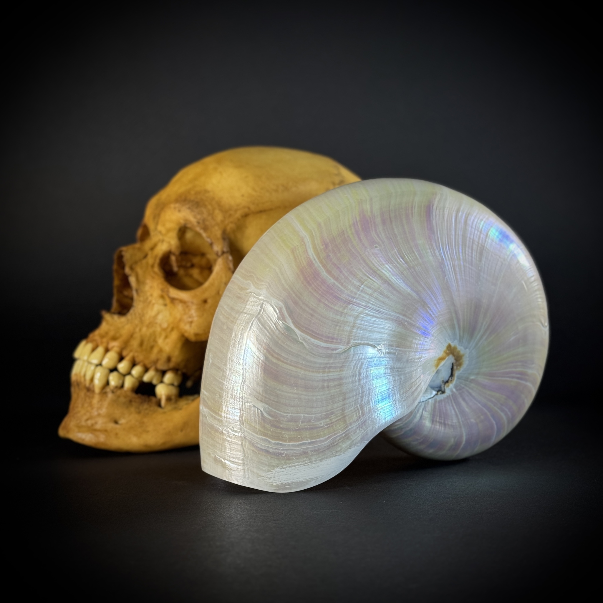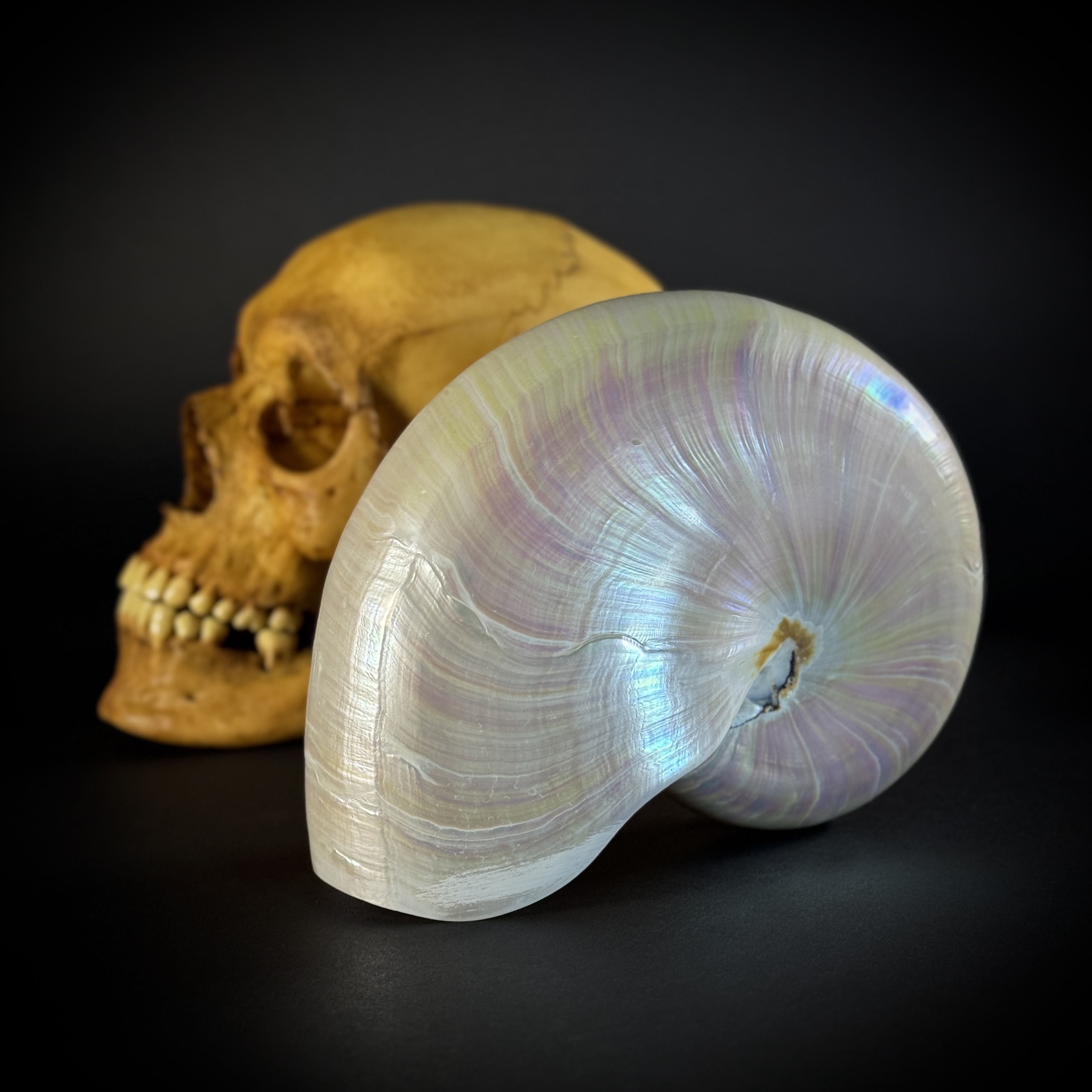 Наутилус в длину 170 мм. Габаритные размеры: 17х14,5х7,5 см. На фото для понимания масштаба Наутилуса рядом череп человека в масштабе 1:1. Фотографии наших изделий являются неотъемлемой частью описания товара, вы покупаете именно то, что видите на фото.