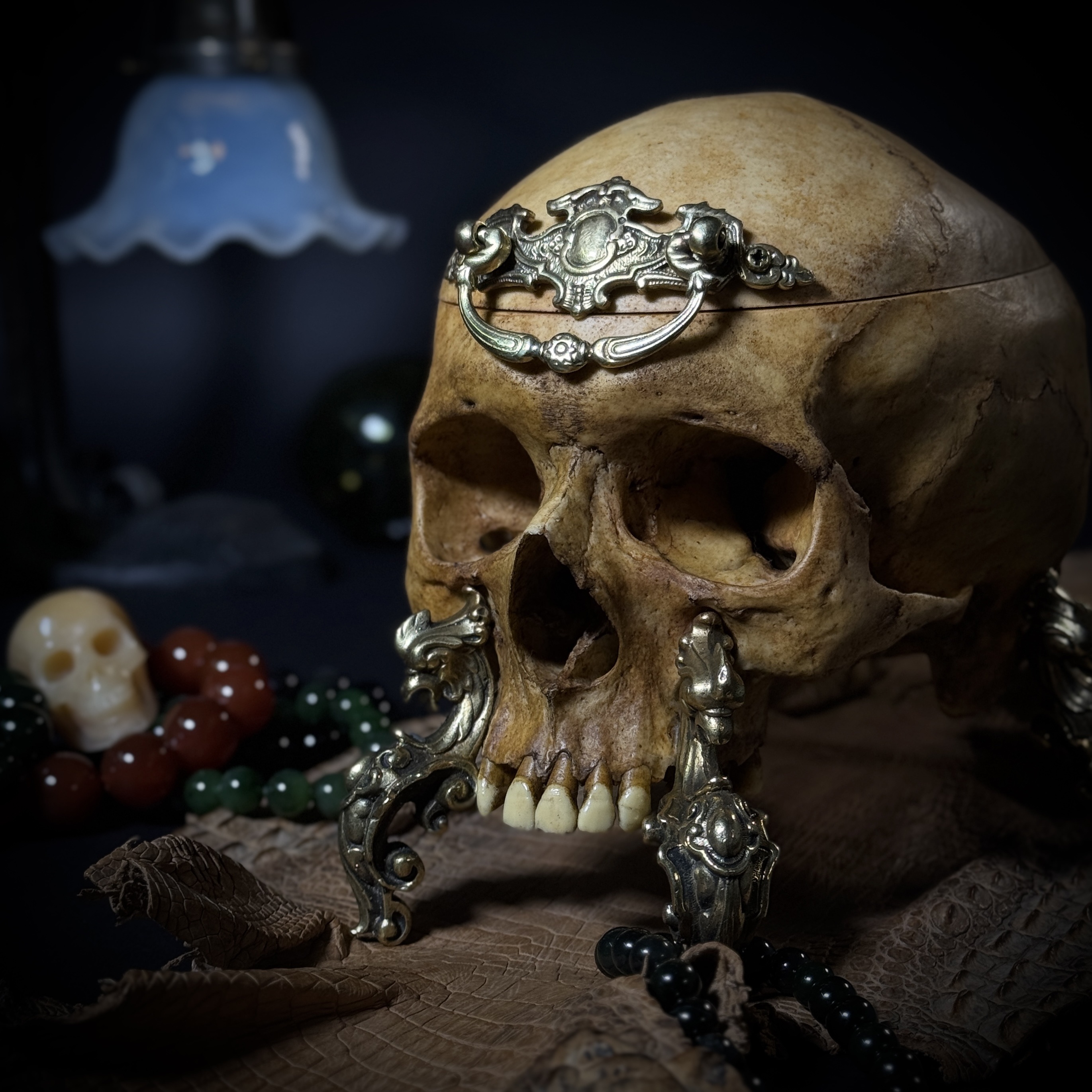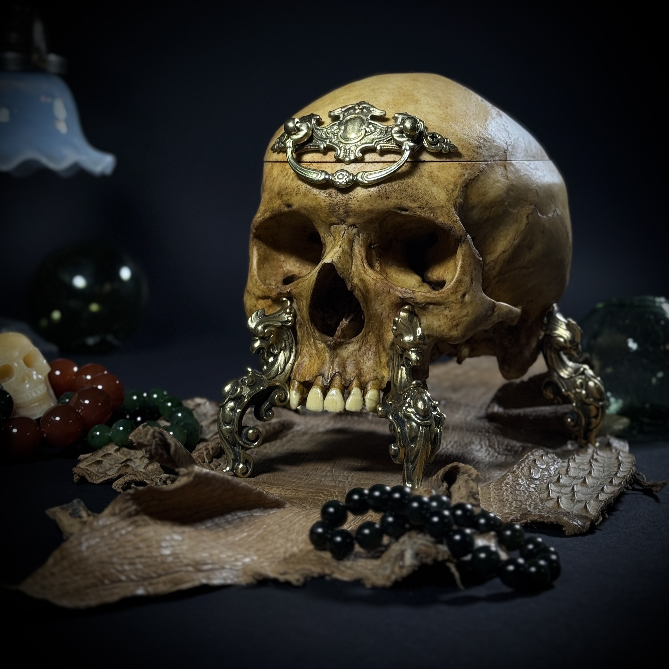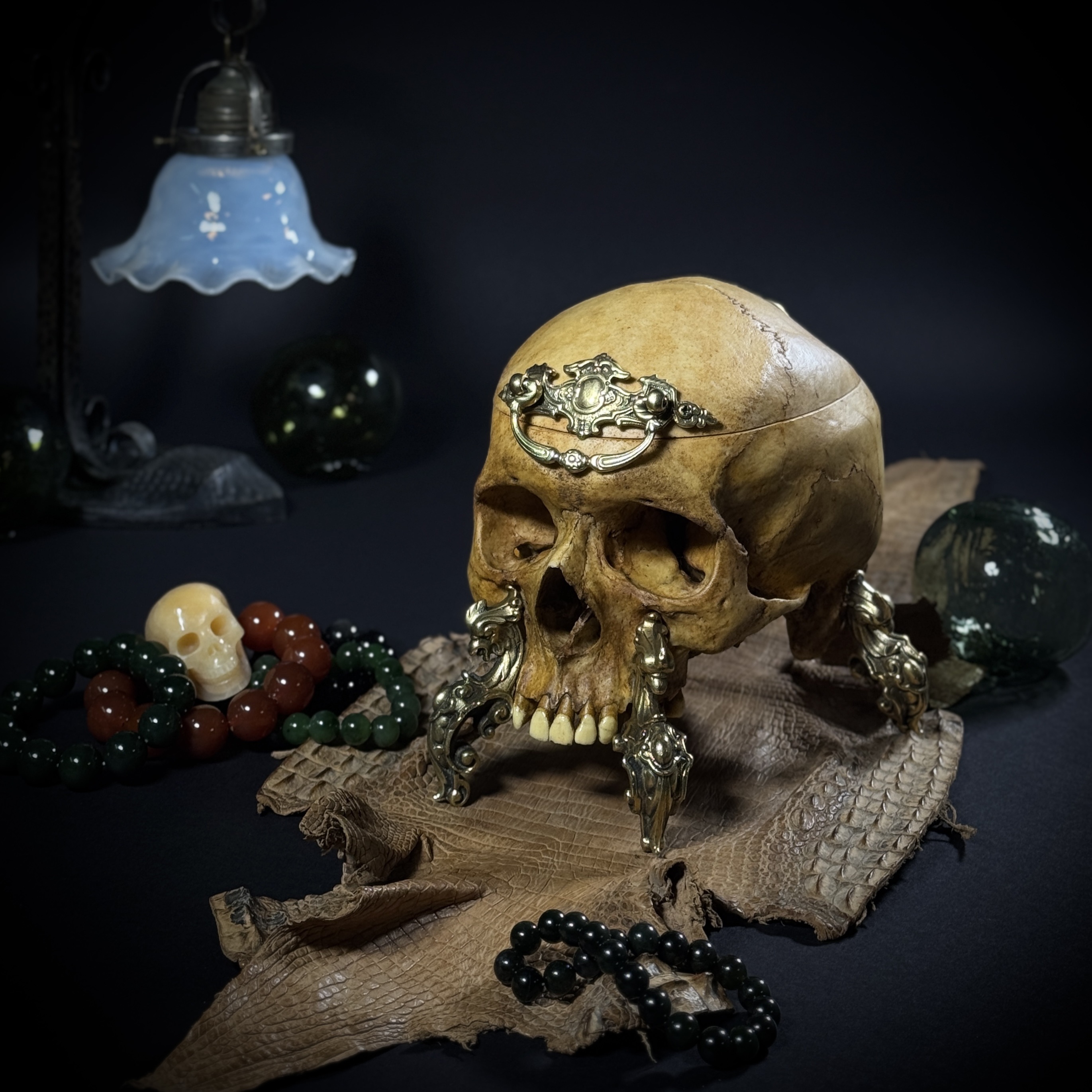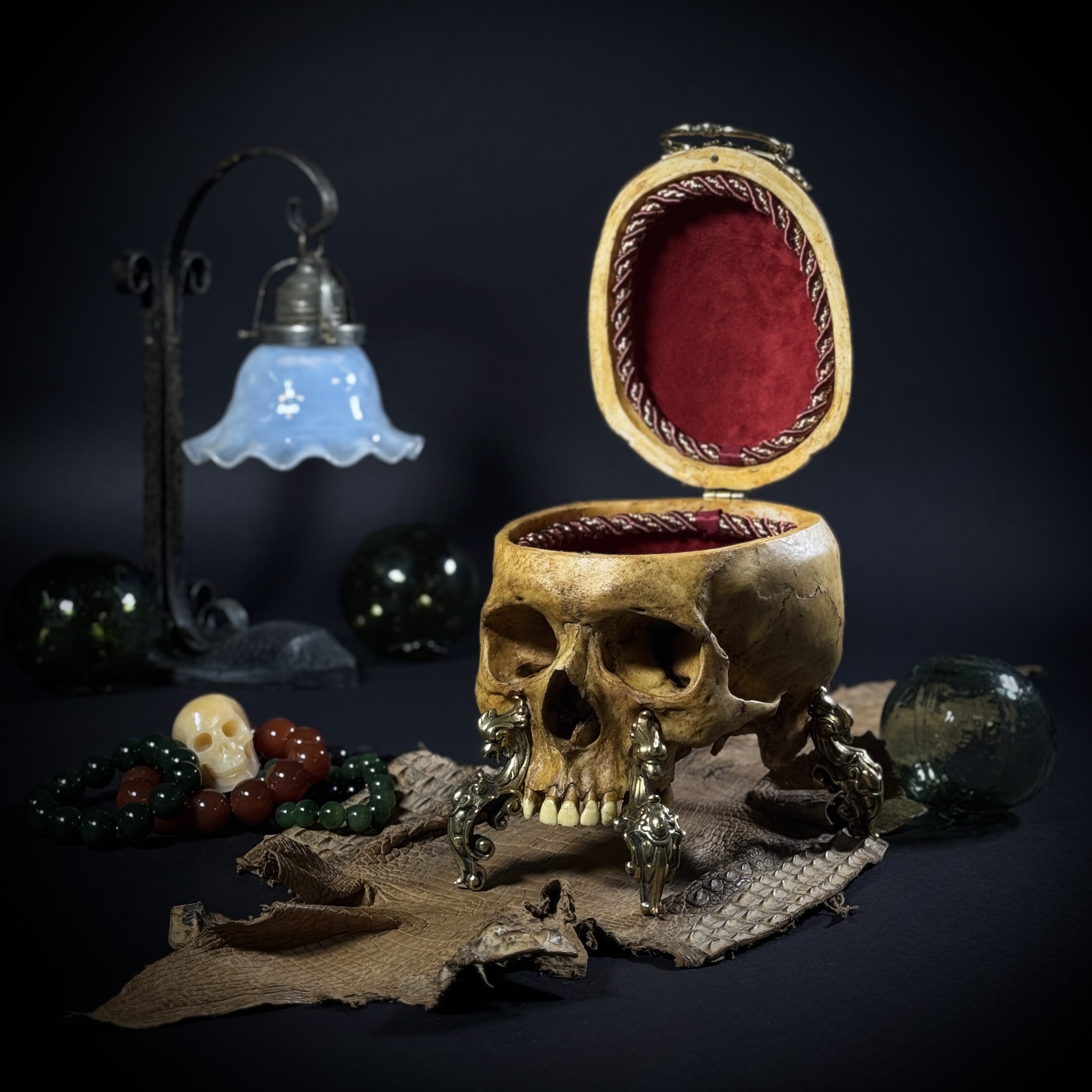 Ночник наполнит комнату мягким не ярким светом. Для вашего таинственного загадочного пространства. Плафон - модель черепа человека, мужской европейский в масштабе 1:1. Материал черепа - полиуретан, лёгкий и прочный, исключительно точно повторяющий настоящий череп человека до мельчайших деталей. Антикварное бронзовое основание: шнур - 1,5 метра, светодиодная лампа - 4Вт, 220В. Габаритные размеры изделия - 30х30х15 см.