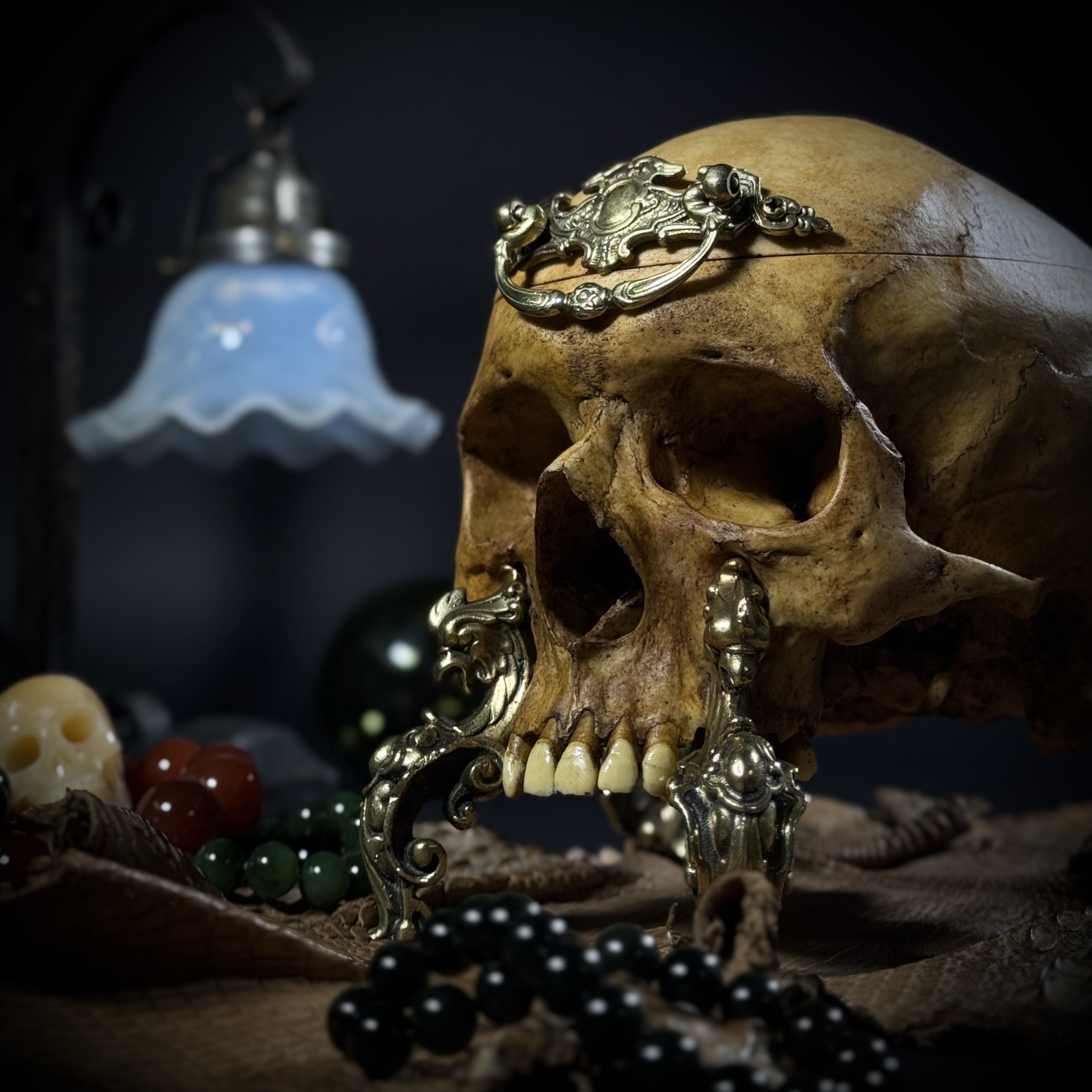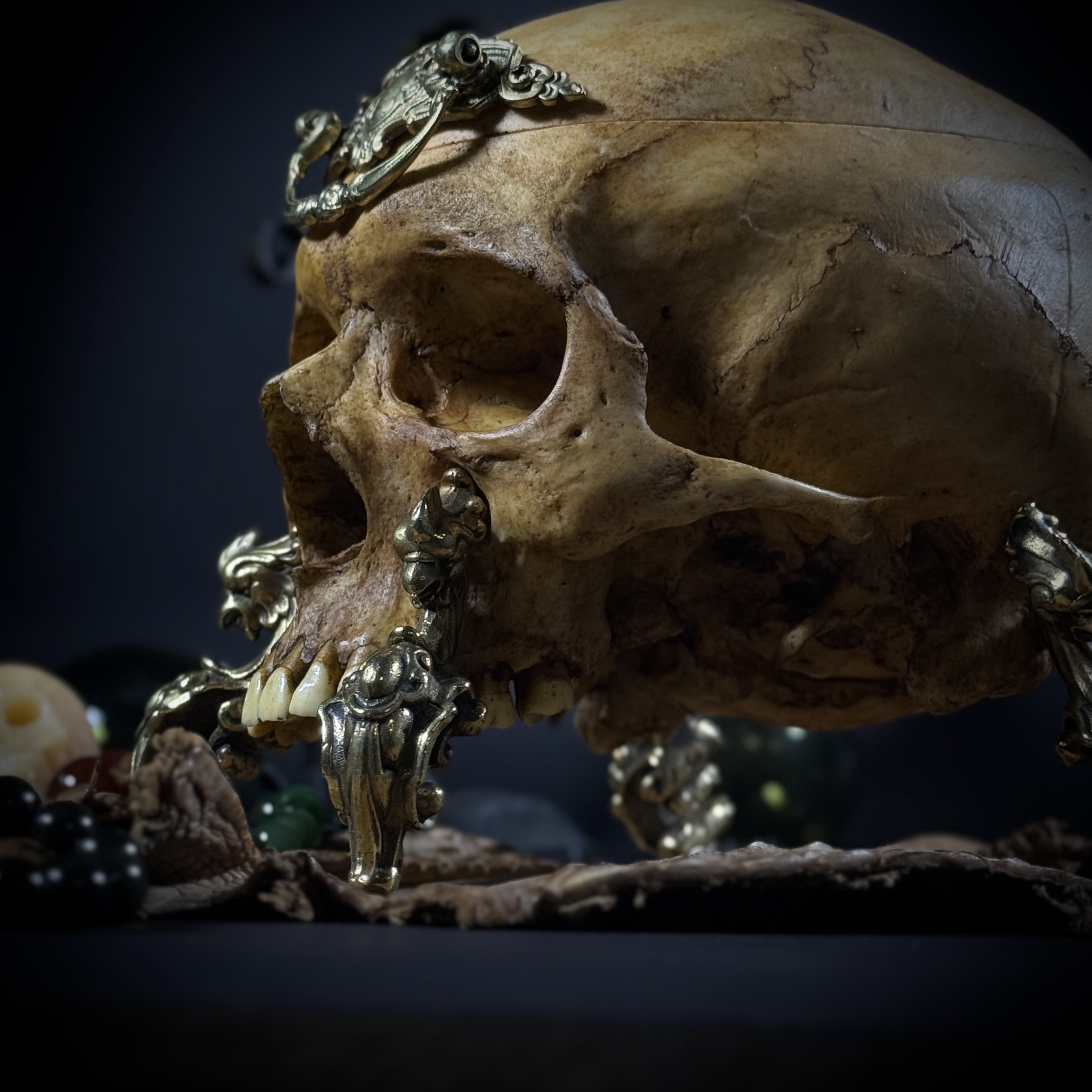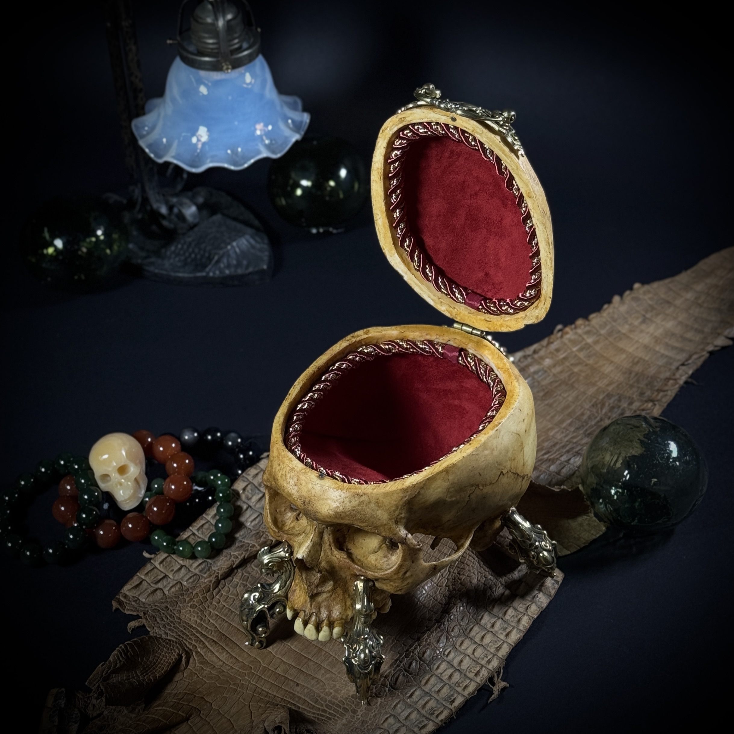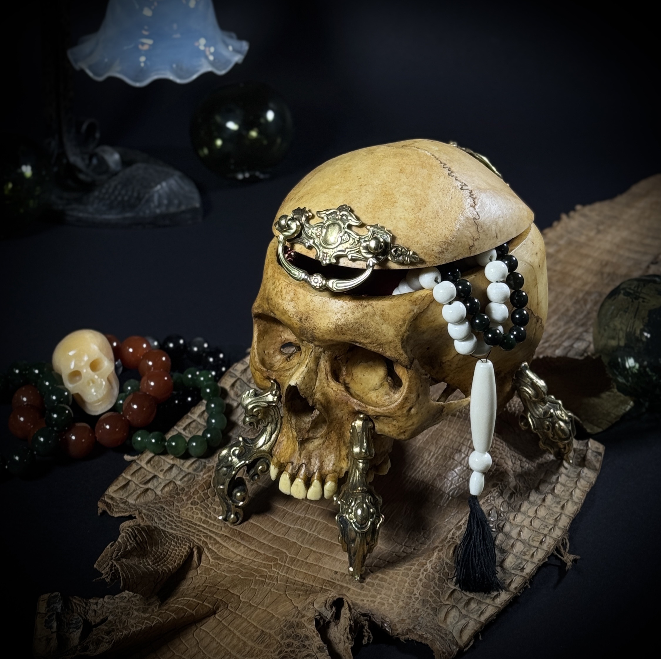 Ночник наполнит комнату мягким не ярким светом. Для вашего таинственного загадочного пространства. Плафон - модель черепа человека, мужской европейский в масштабе 1:1. Материал черепа - полиуретан, лёгкий и прочный, исключительно точно повторяющий настоящий череп человека до мельчайших деталей. Антикварное бронзовое основание: шнур - 1,5 метра, светодиодная лампа - 4Вт, 220В. Габаритные размеры изделия - 30х30х15 см.
