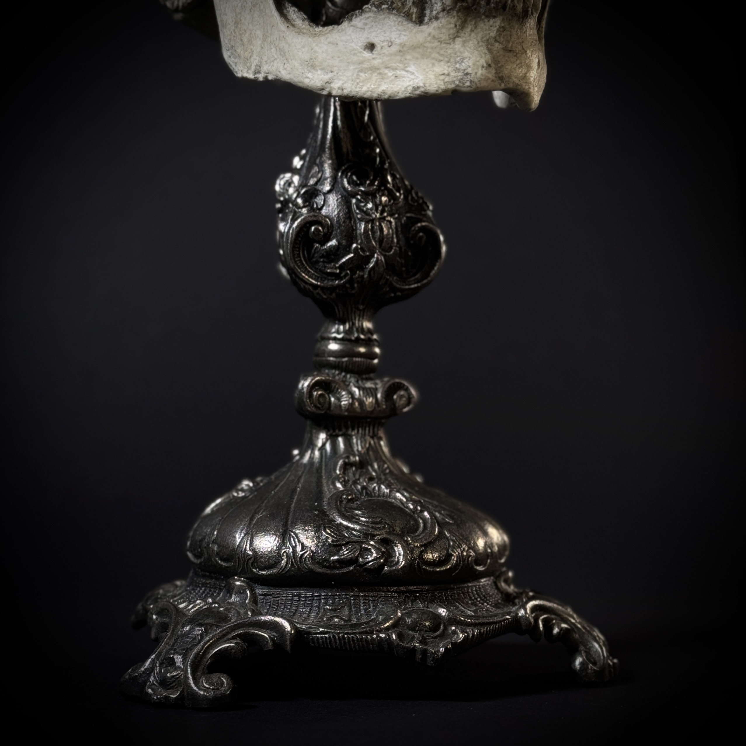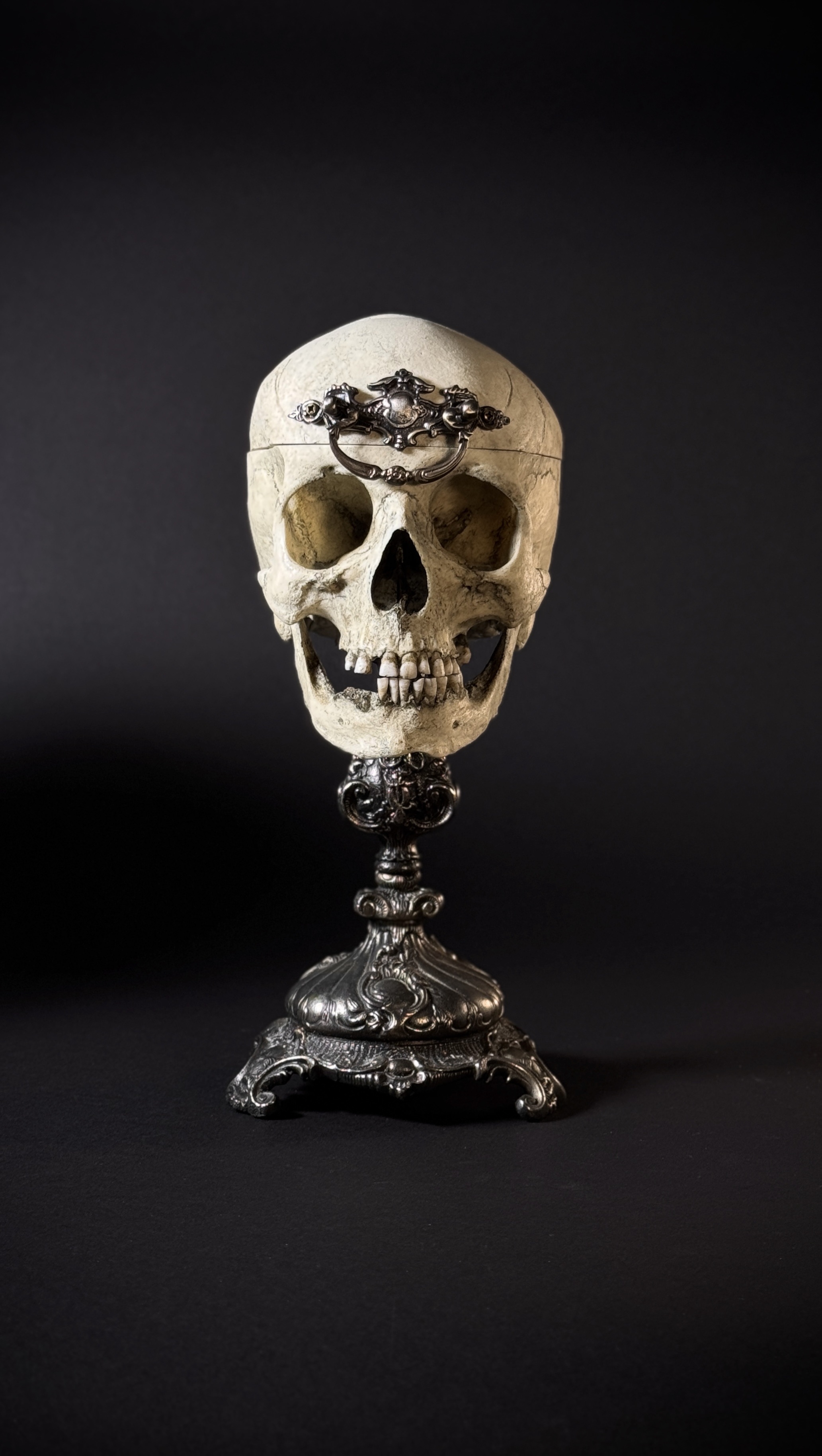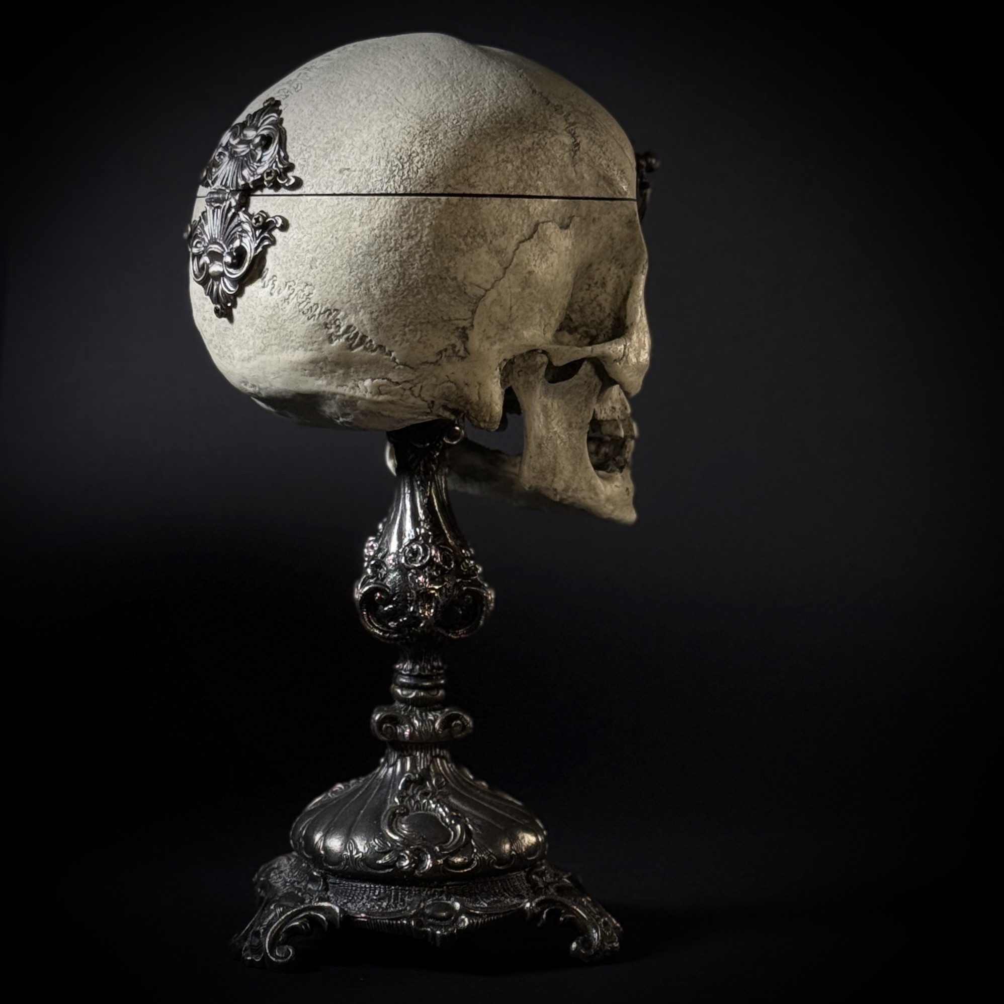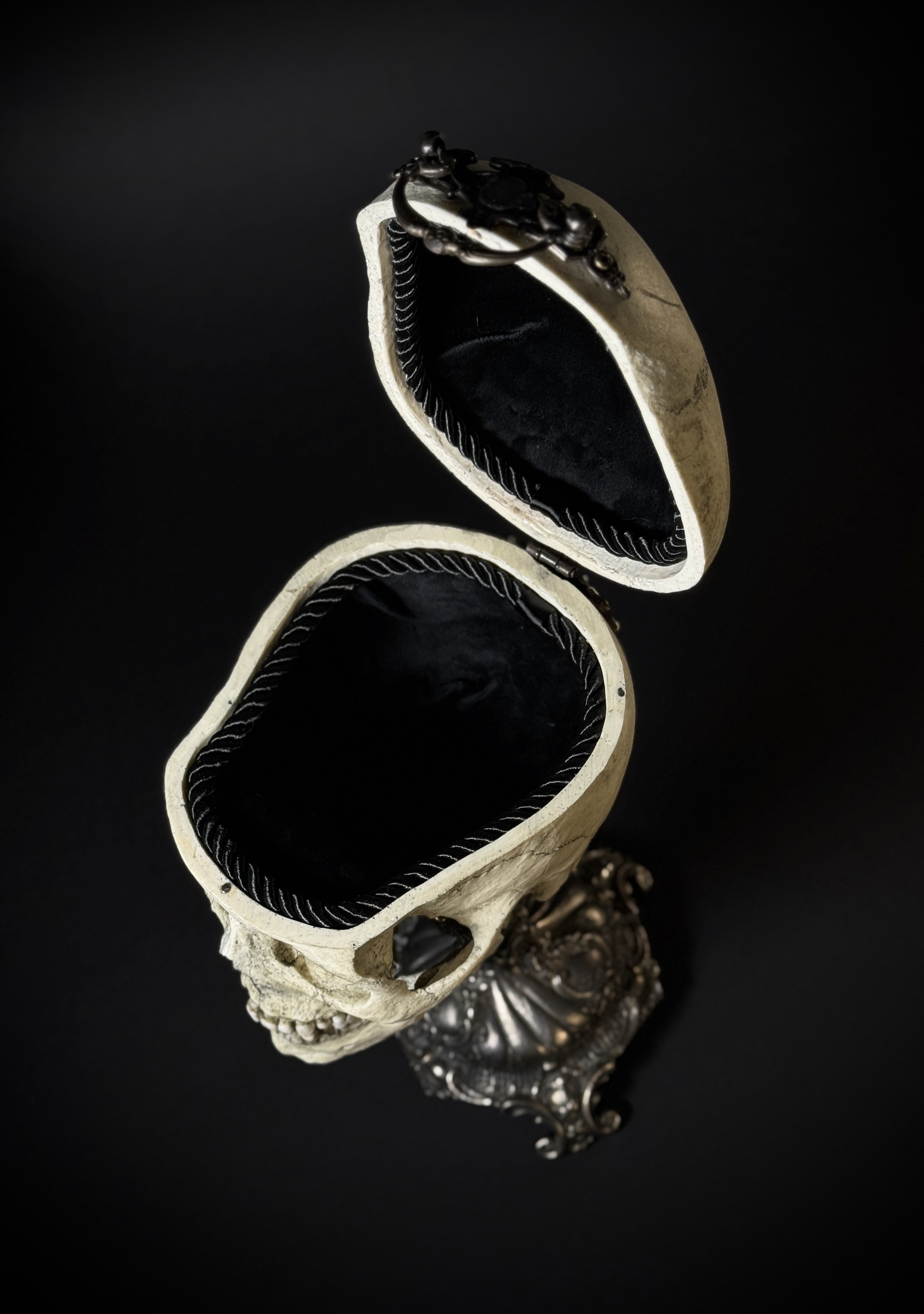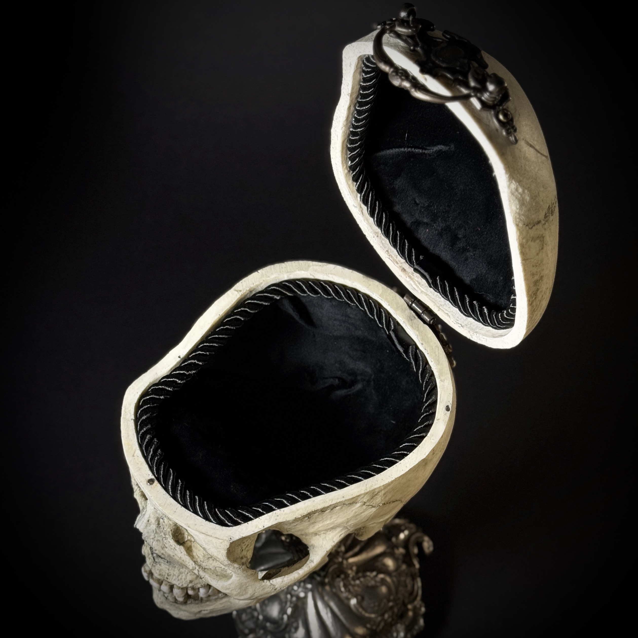 Шкатулка «Череп человека» - это произведение искусства, созданное для хранения и демонстрации ценных предметов. Основание у шкатулки антикварное винтажное. Фурнитура из бронзы, литьё. Череп человека выполнен из полиуретана высокого качества в масштабе 1:1. Полностью ручная работа.