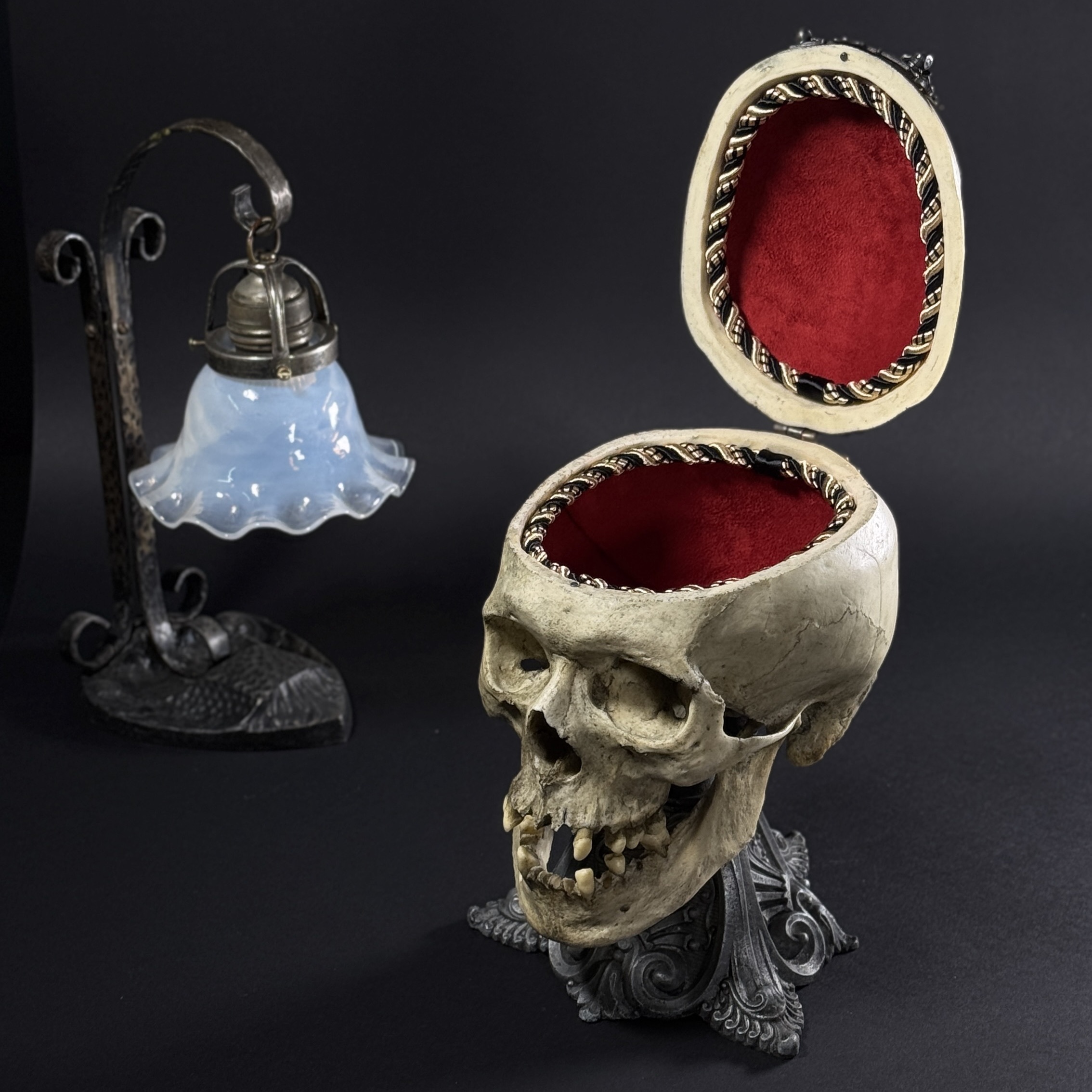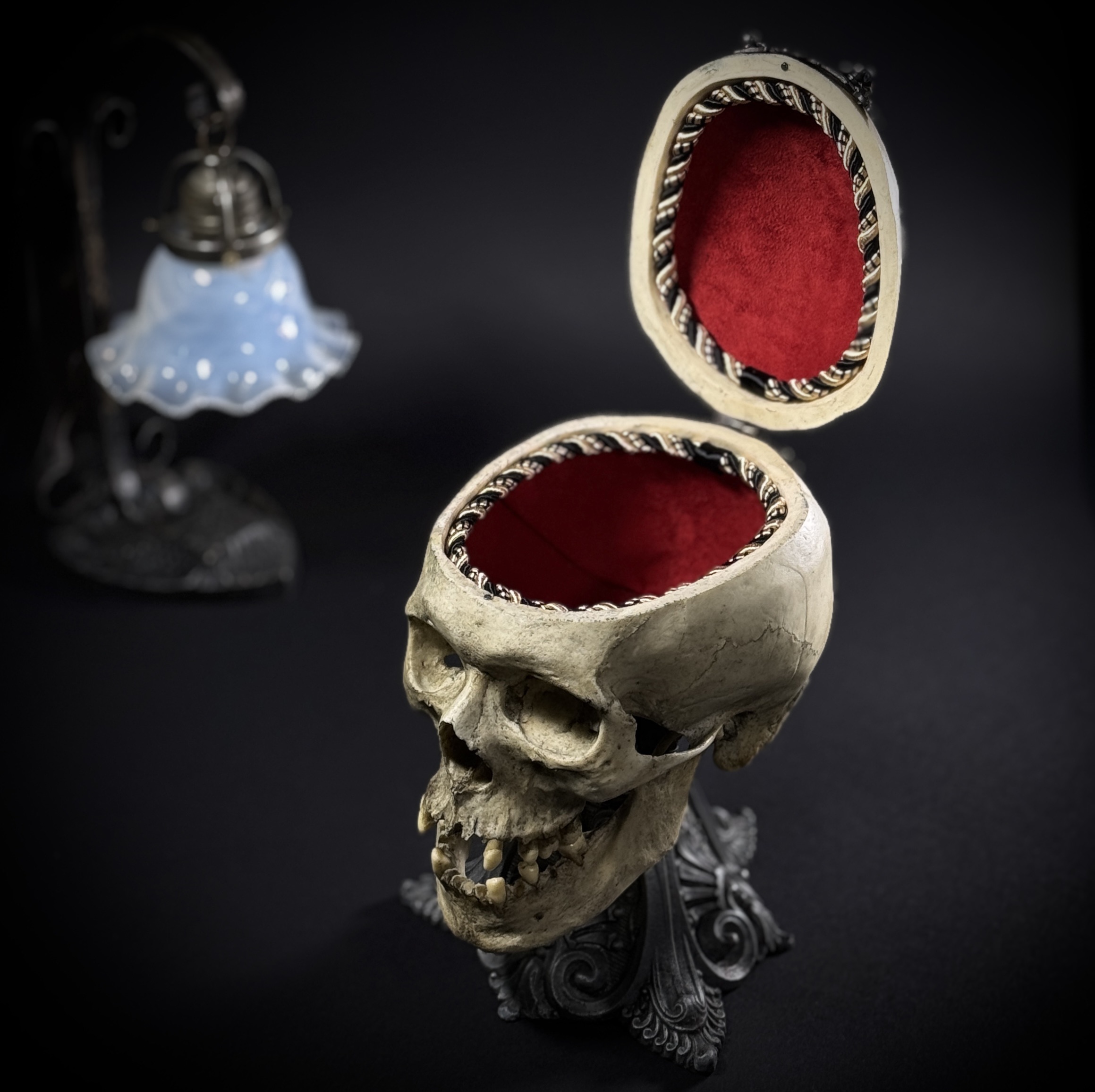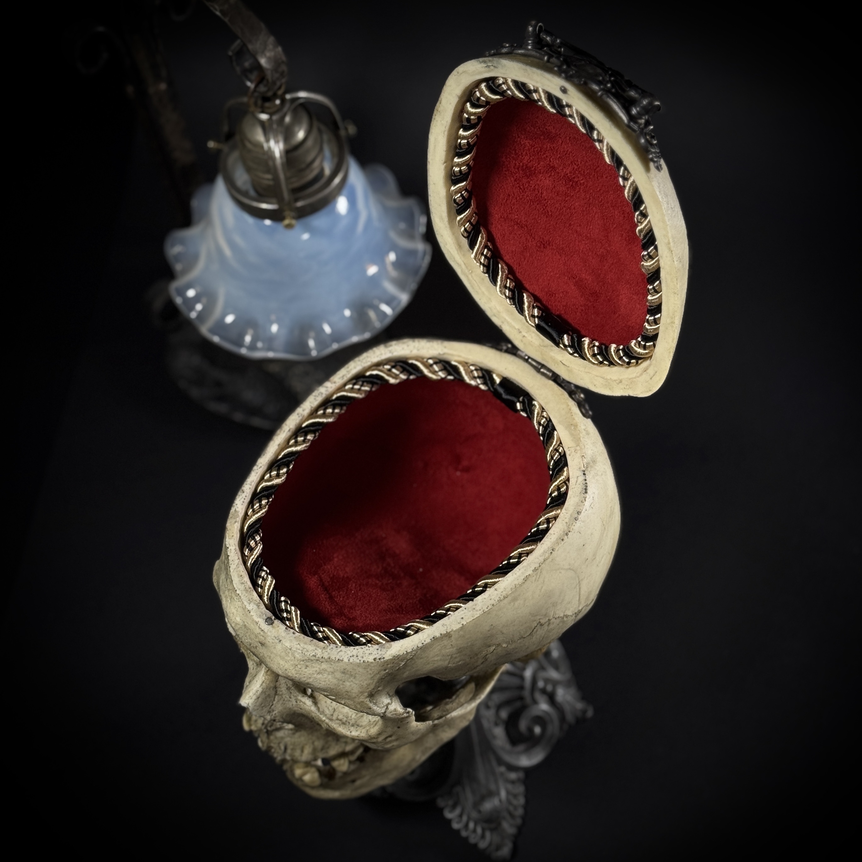 Высота шкатулки 25 см, высота основания 17 см, габаритная глубина изделия 21 см. Материалы: шпиатр, бронза, пластик, бархат, шёлк. Полностью ручная работа. Шкатулка не только послужит удобным местом для хранения различных мелочей, но и украсит ваш интерьер, придав ему изысканность и стиль. В такой шкатулке можно хранить украшения, монеты и другие памятные вещицы.