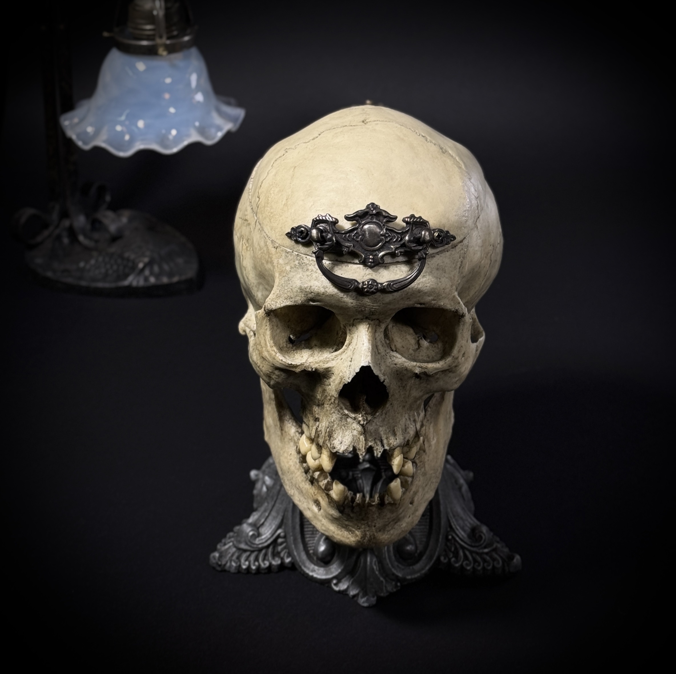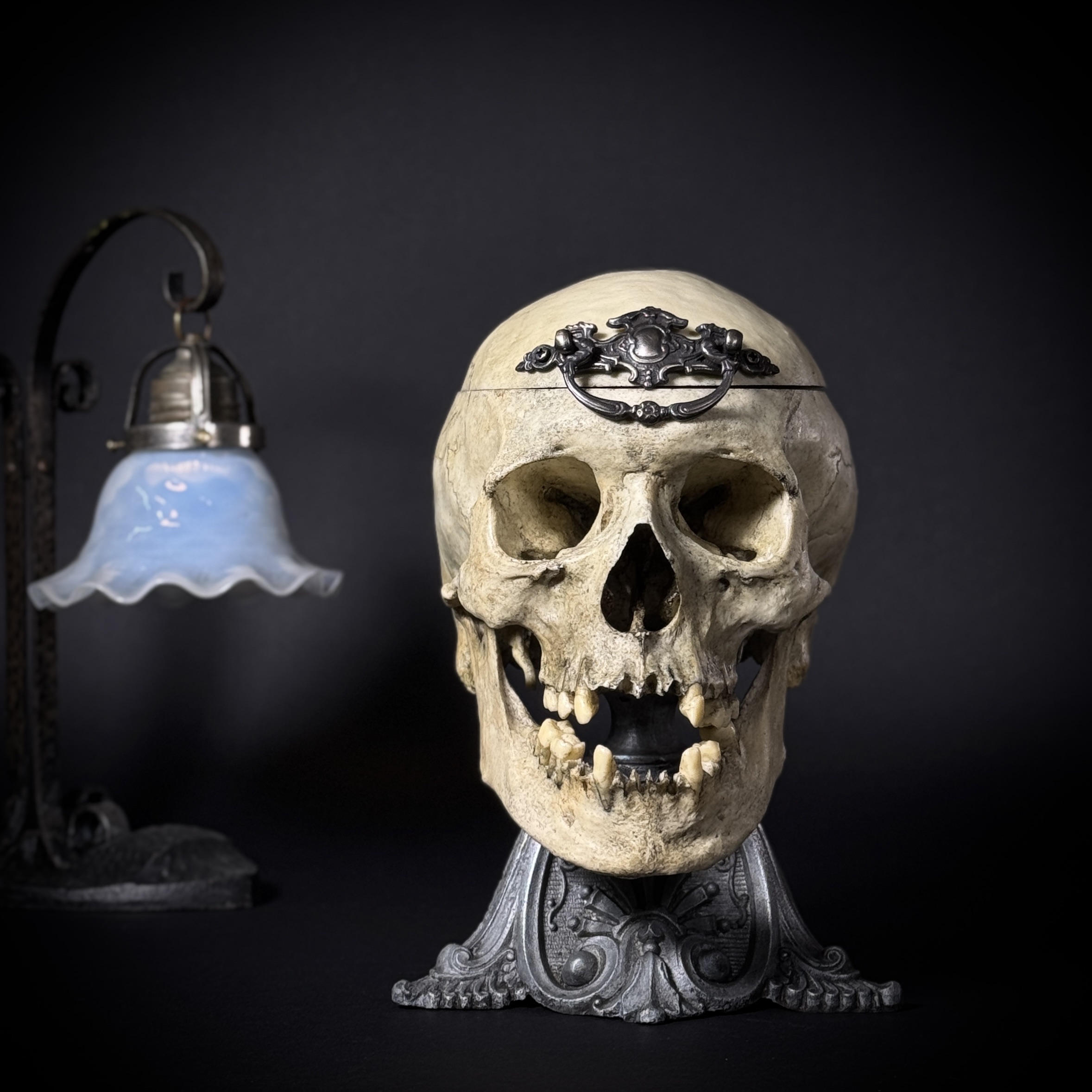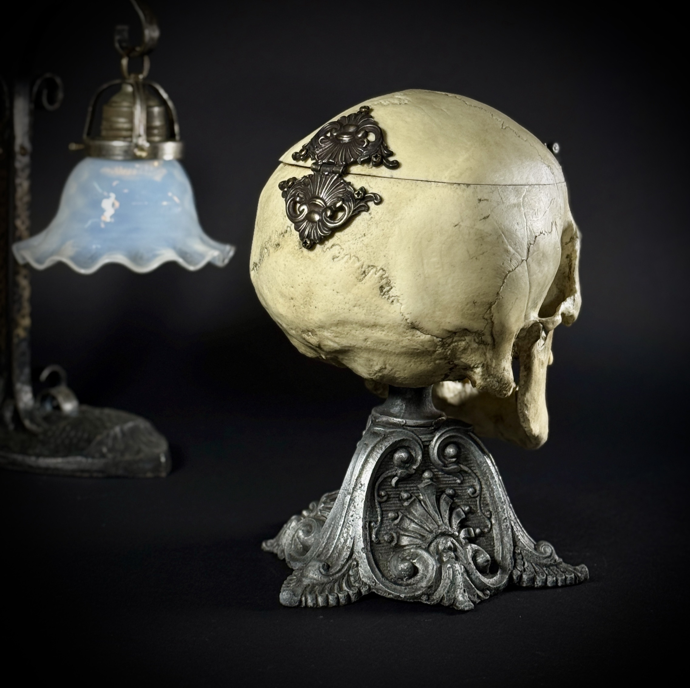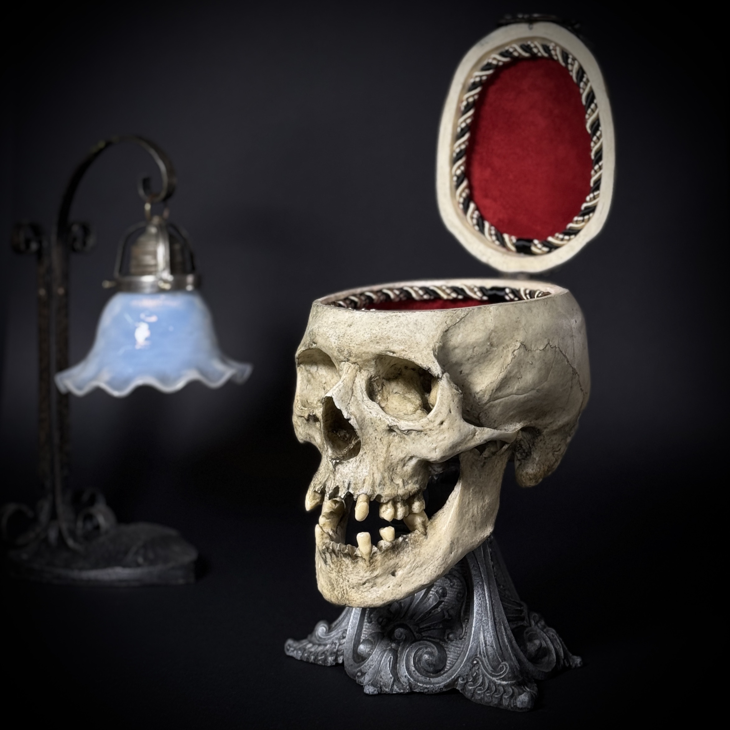 Высота шкатулки 25 см, высота основания 17 см, габаритная глубина изделия 21 см. Материалы: шпиатр, бронза, пластик, бархат, шёлк. Полностью ручная работа. Шкатулка не только послужит удобным местом для хранения различных мелочей, но и украсит ваш интерьер, придав ему изысканность и стиль. В такой шкатулке можно хранить украшения, монеты и другие памятные вещицы.