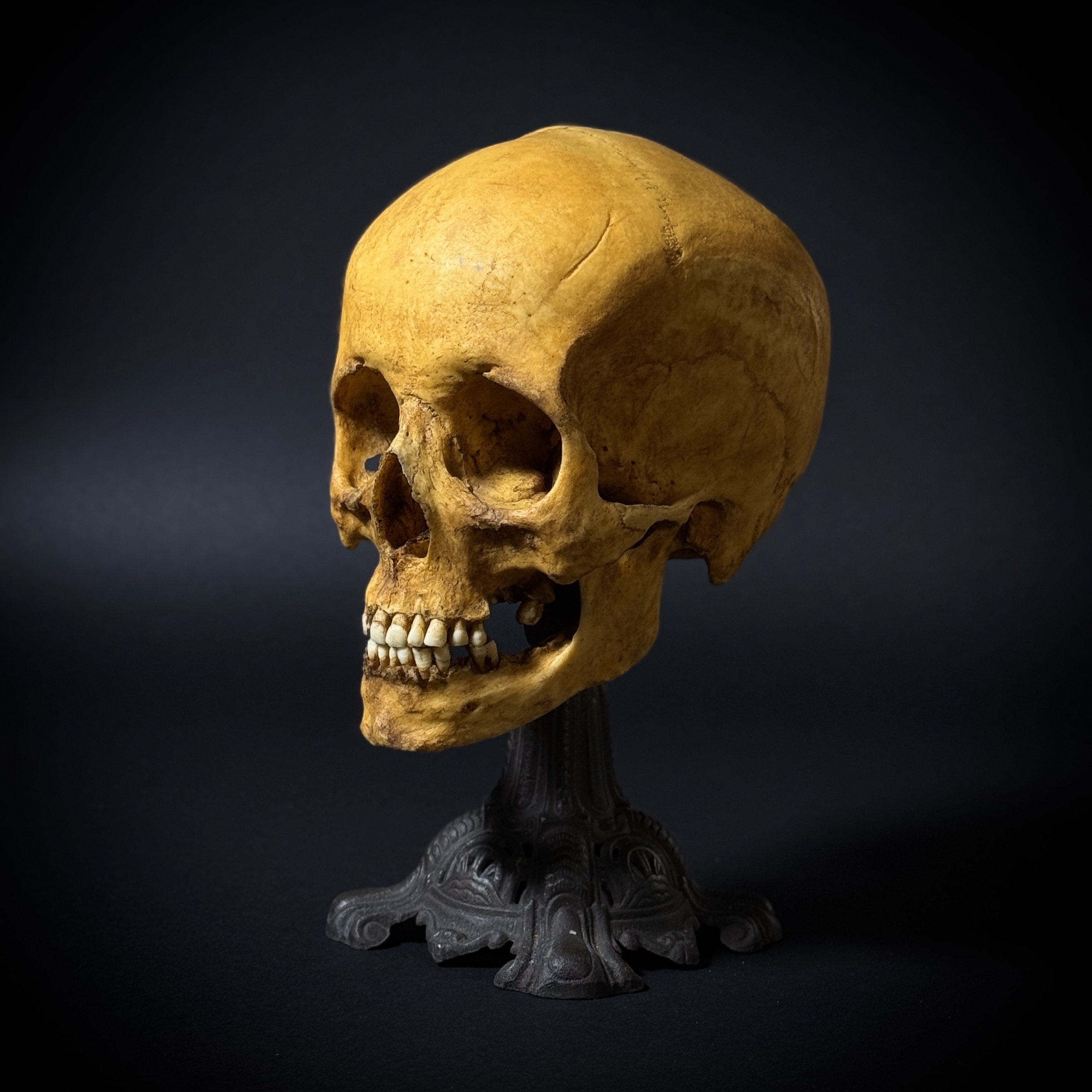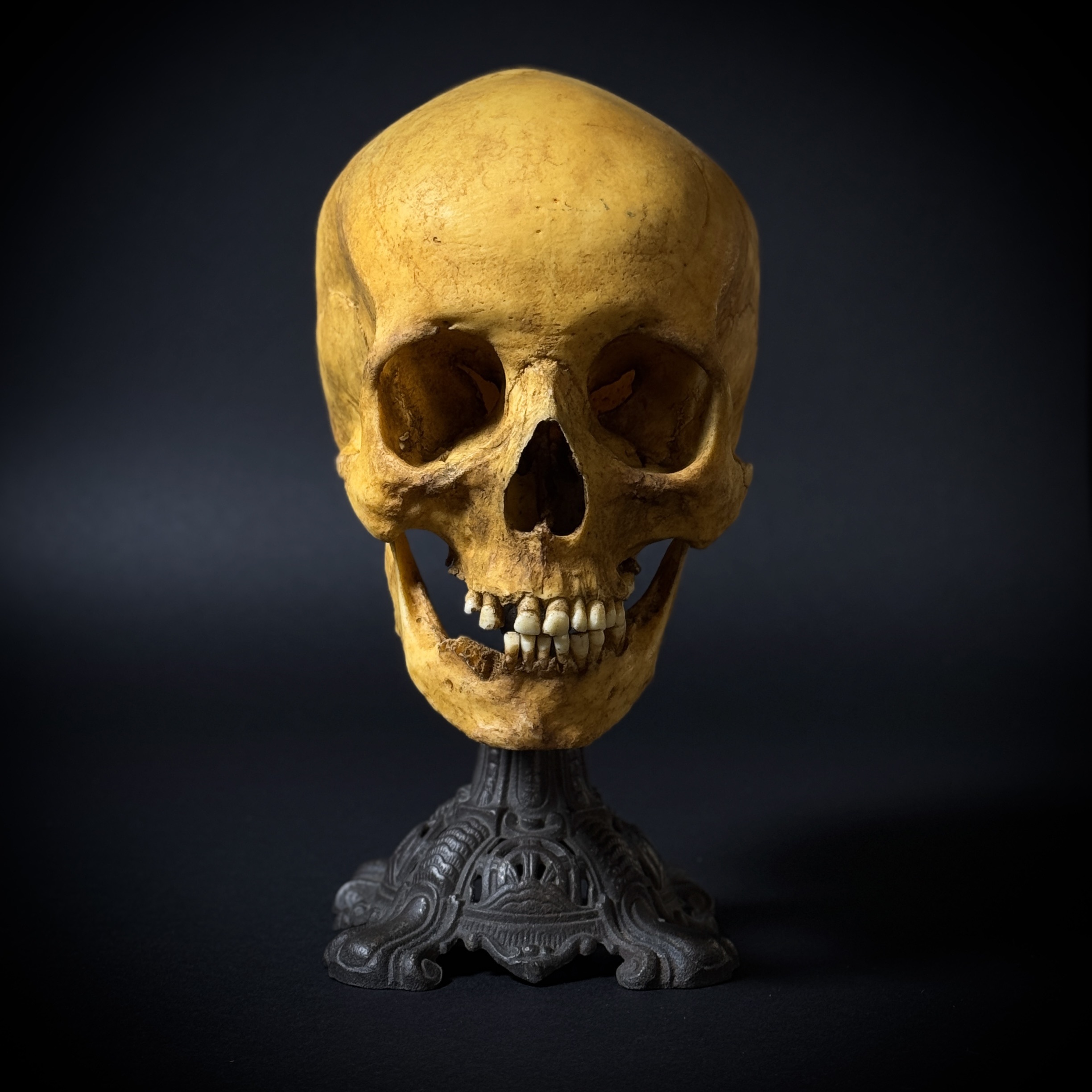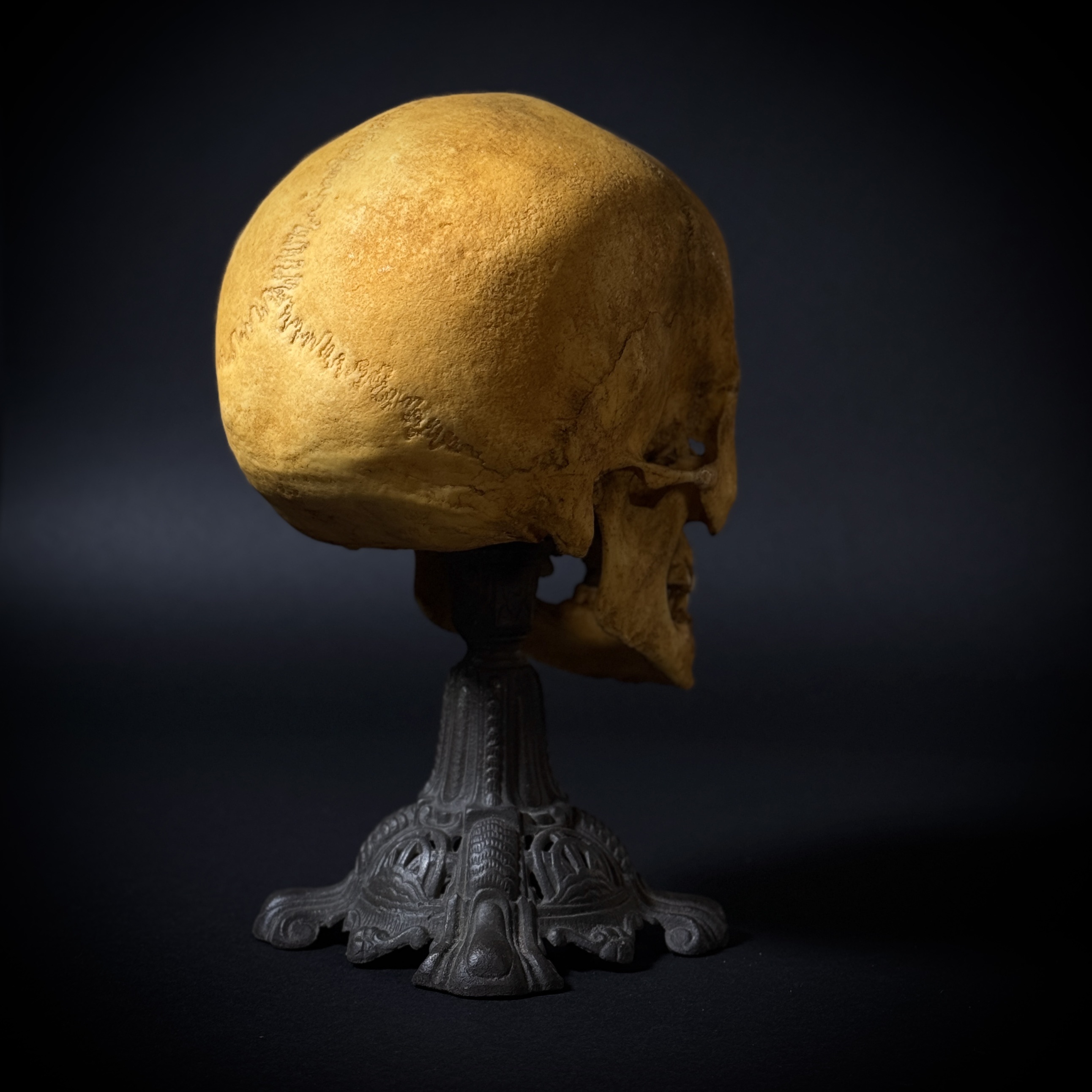 Статуэтка «Череп человека» — эффектный предмет декора, сочетающий реалистичность исполнения с винтажной эстетикой. Полностью ручная работа. Основные характеристики: общая высота композиции - 27 см. Материал черепа: высококачественный полиуретан. Масштаб черепа - 1:1 (анатомическая модель). Основание: чугунное, антикварное.