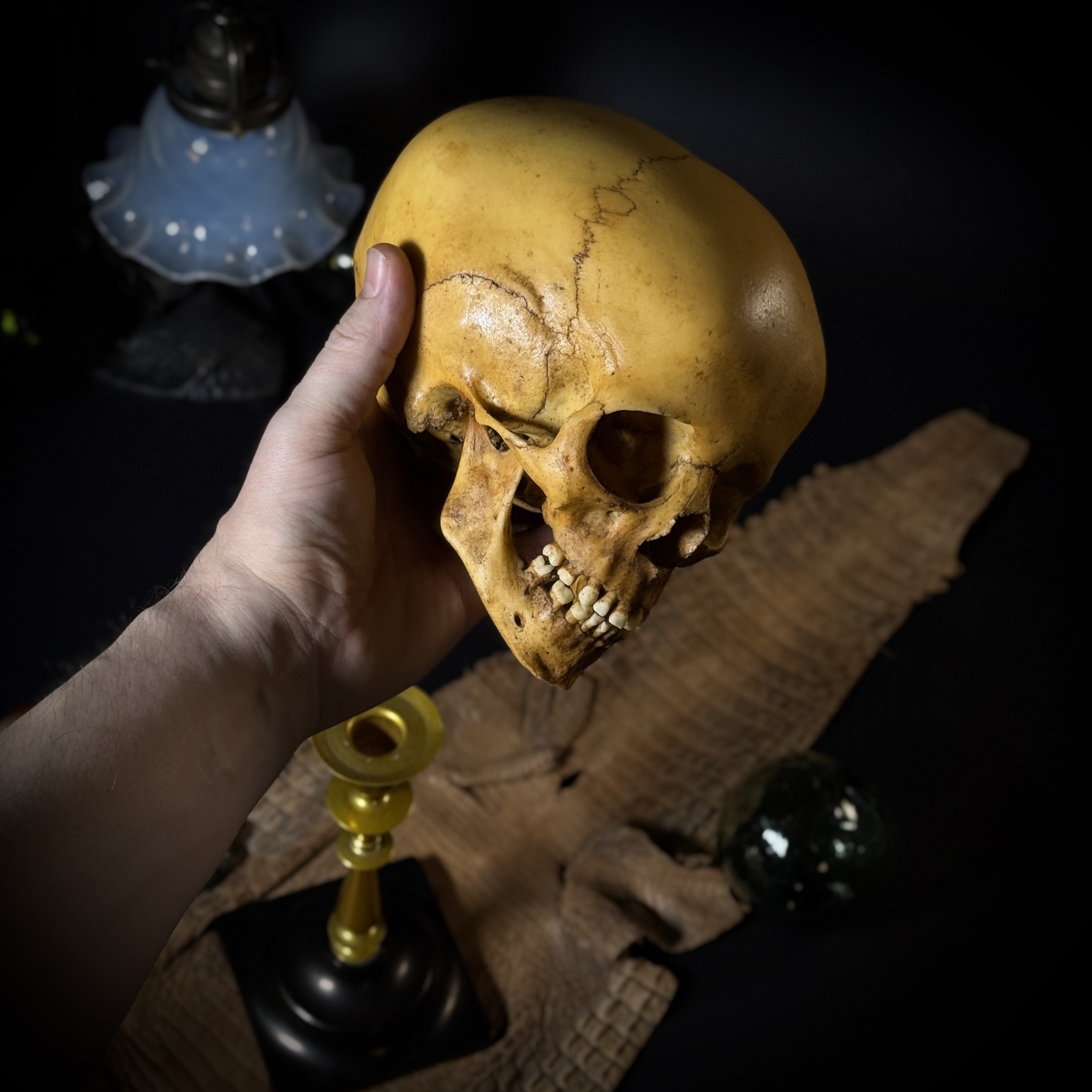 Обратите внимание: череп можно снять с основания, это выполнено для безопасной транспортировки изделия. Статуэтка «Череп человека» — эффектный предмет декора, сочетающий реалистичность исполнения с винтажной эстетикой. Полностью ручная работа. Основные характеристики: общая высота композиции - 35 см. Материал черепа: высококачественный полиуретан. Масштаб черепа - 1:1 (анатомическая модель), размер черепа: высота – 14 см, ширина - 14,4 см, глубина - 20,3 см.Основание: винтажное антикварное.