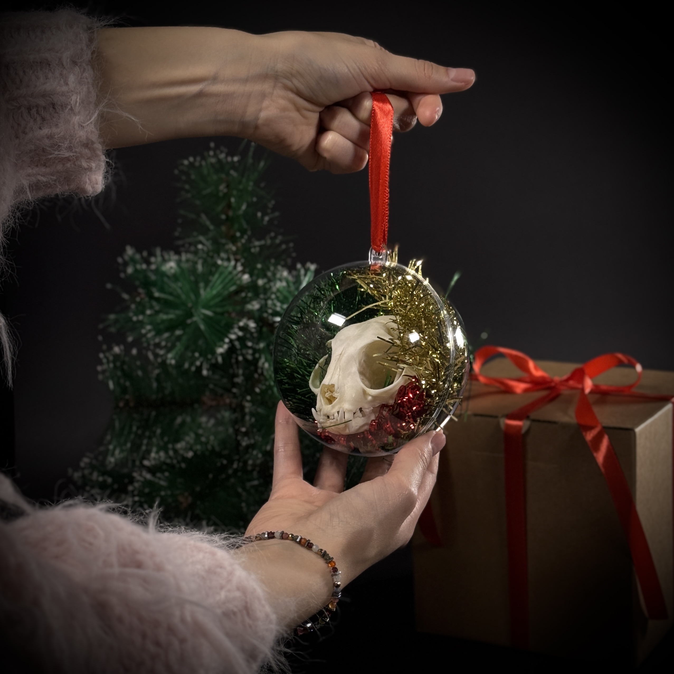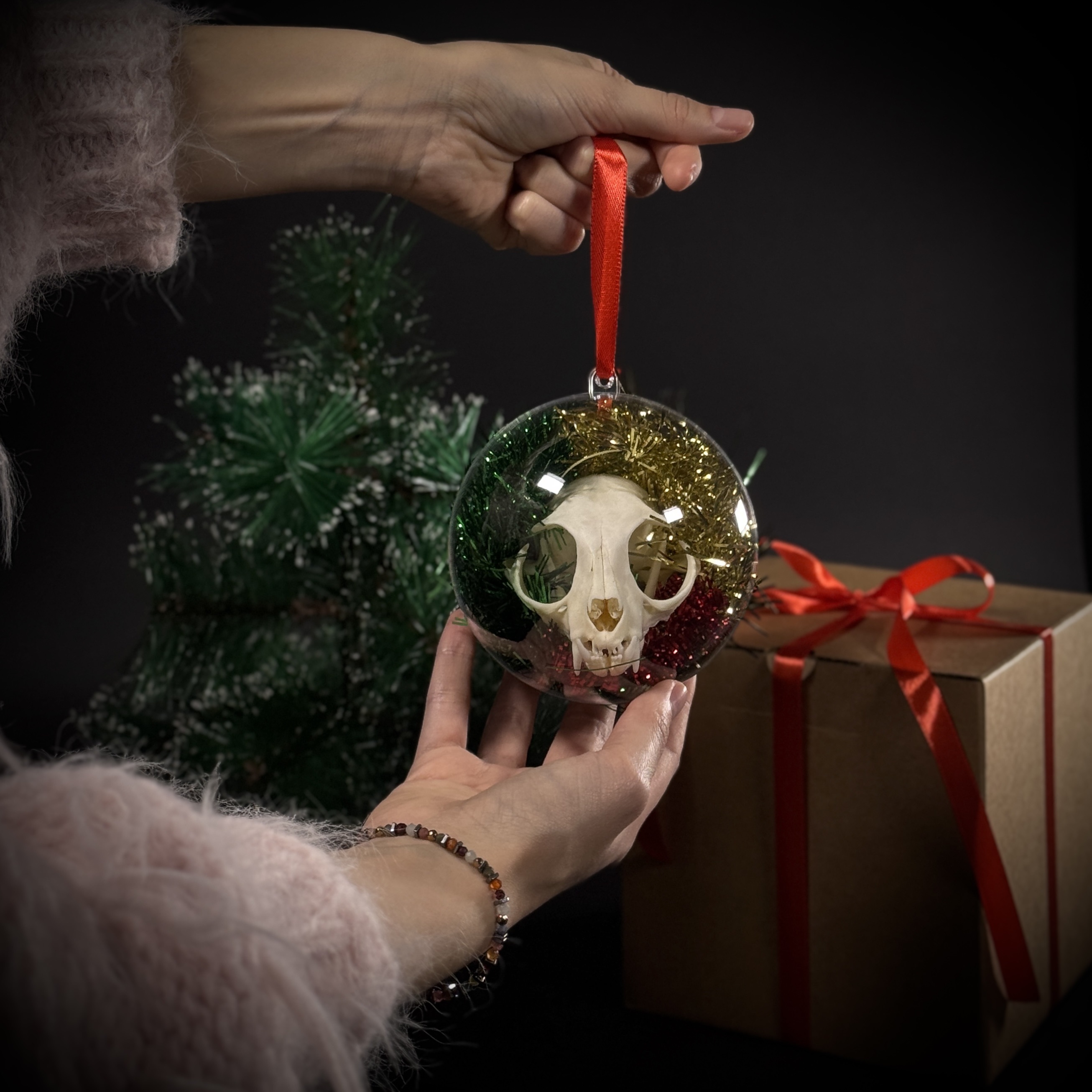 Ёлочный шар. Откройте для себя неповторимый новогодний аксессуар — ёлочный шар с изюминкой!Внутри изящного круглого шара диаметром 12 см, который можно открыть, скрывается необычный декор — череп котика. Это сочетание праздничной классики и дерзкой оригинальности станет ярким акцентом на вашей новогодней ёлке или неожиданным подарком для ценителей нестандартных решений.